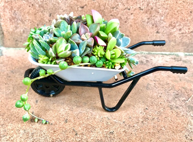 可愛い一輪車に寄せ植えをしてみました。できるだけ色々な種類の多肉の苗を入れました。机上や窓辺にいかがですか? 苗が根を張りやすいように、固まる土は使っておりません。