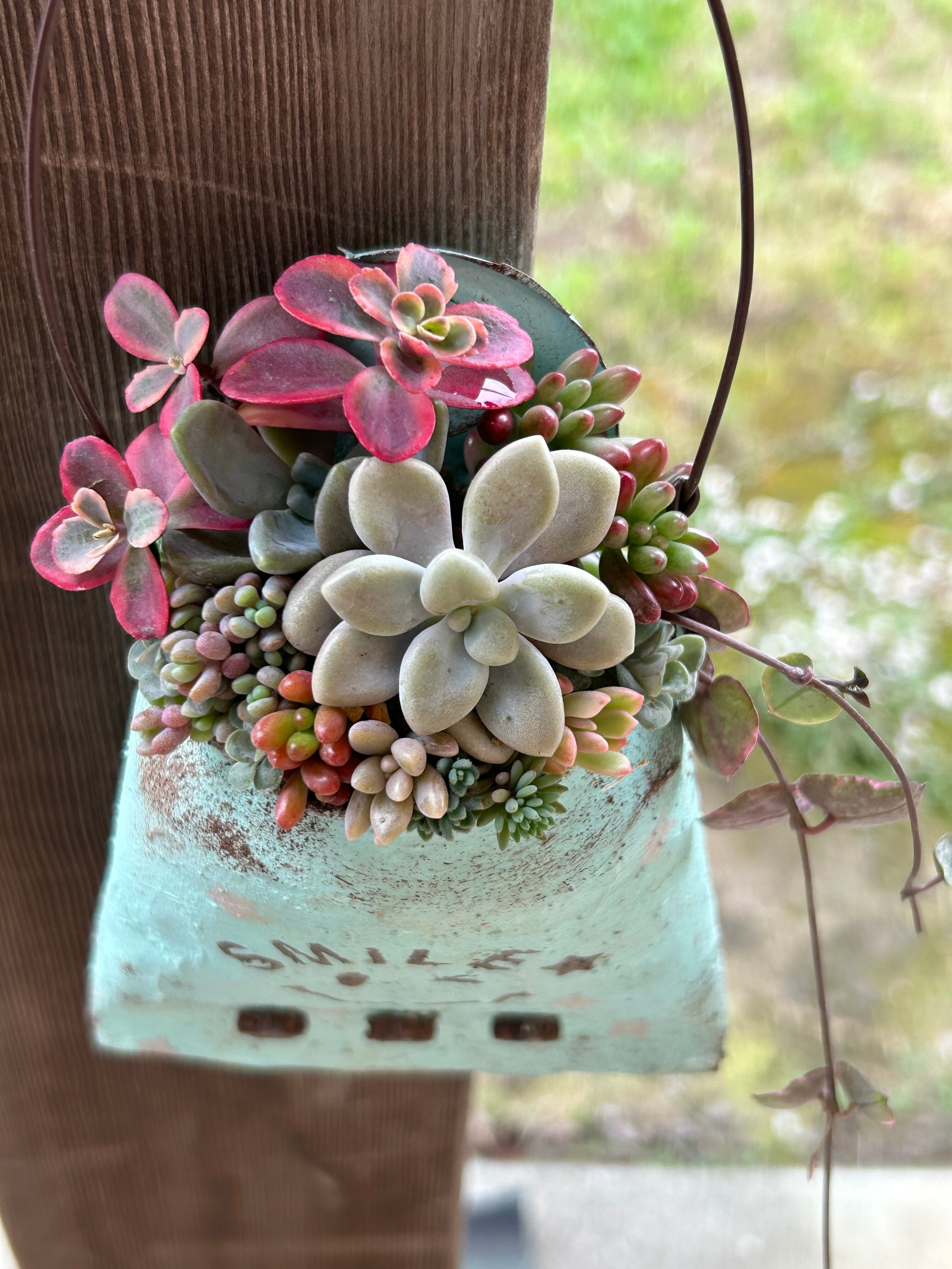 吊り下げ式の青いプランターに多肉植物を寄せ植しました。ファイヤークラッカーの葉が、とても綺麗な赤に、だるま秀麗が薄紫に紅葉しています。
