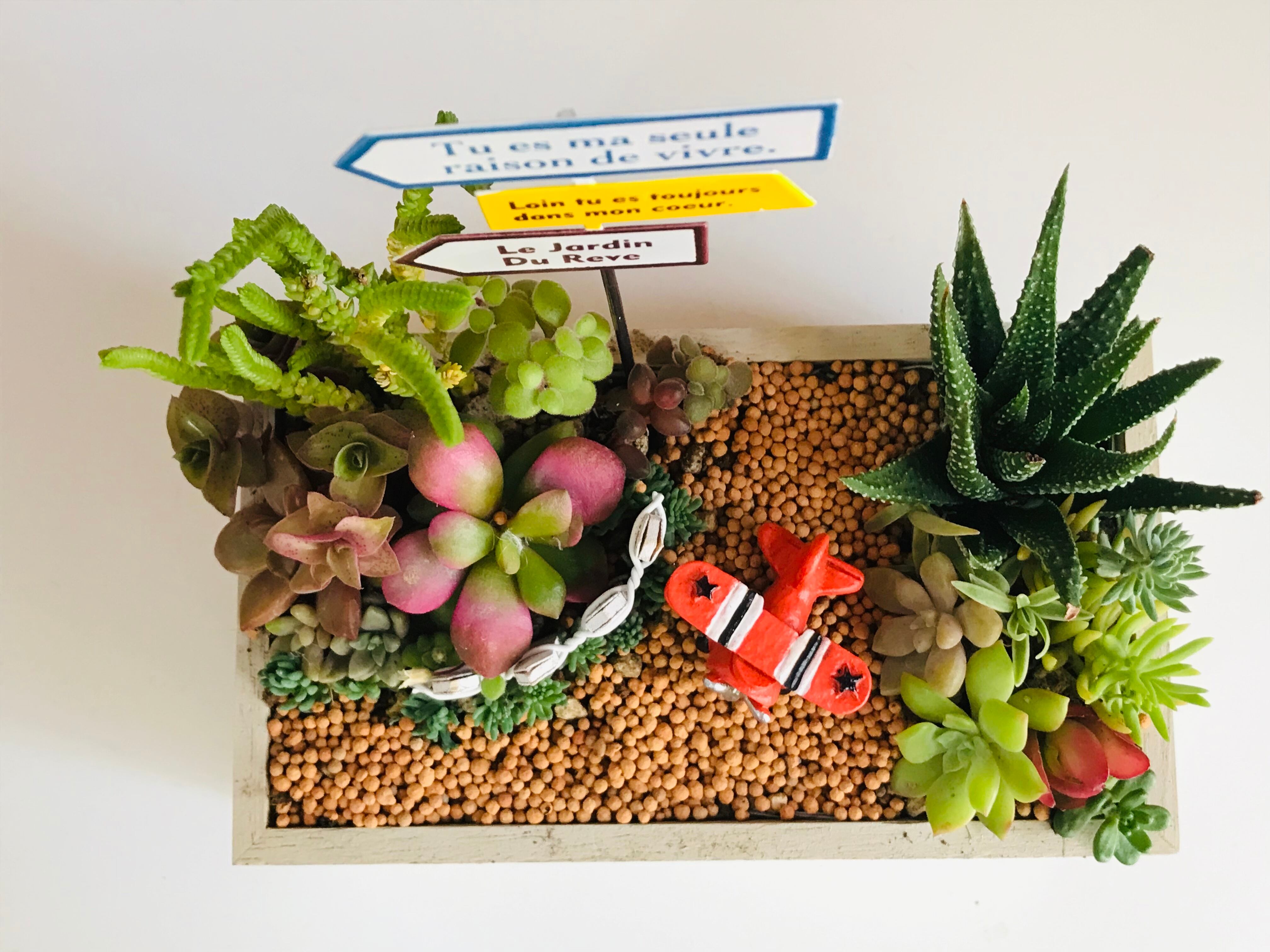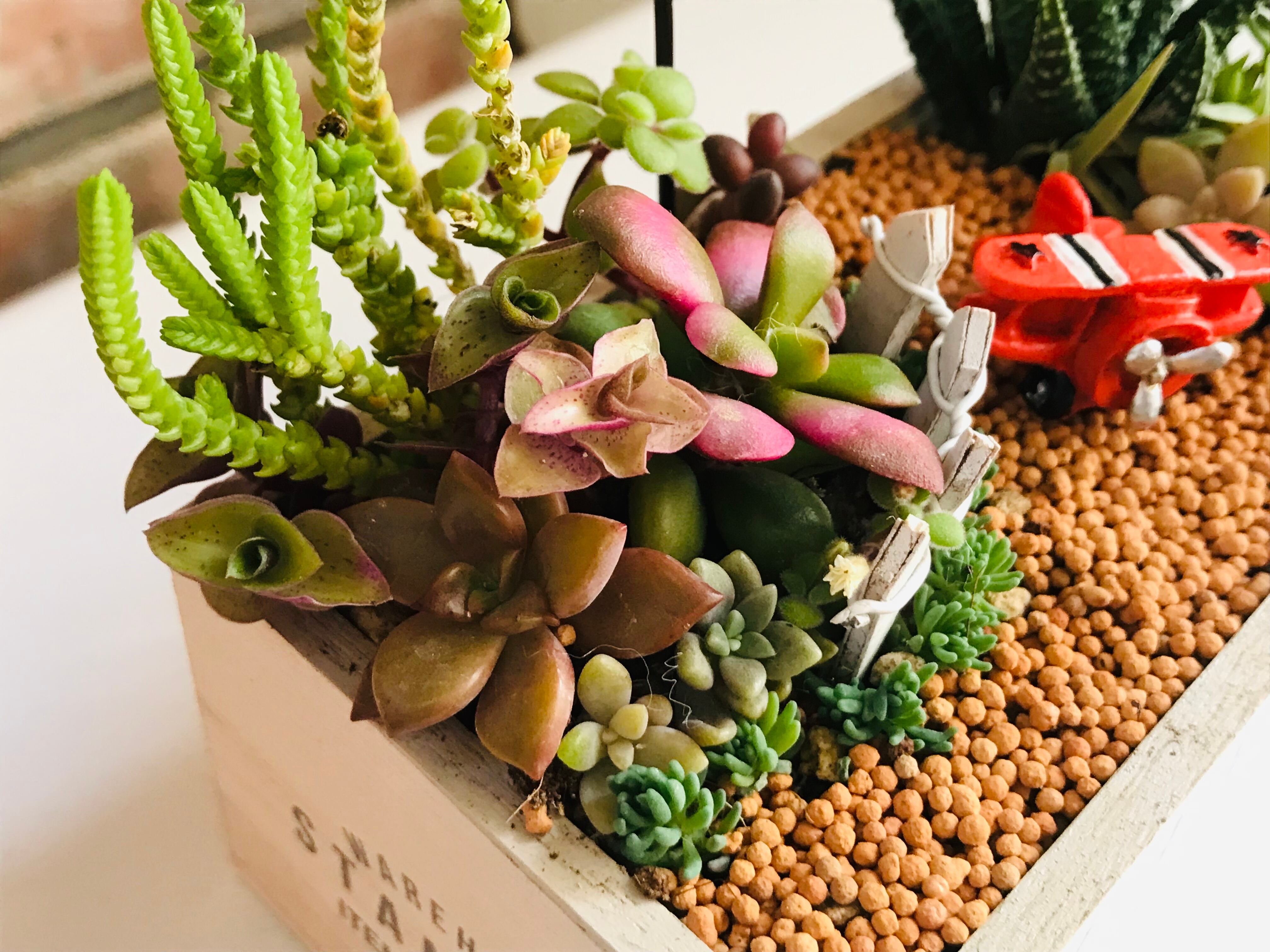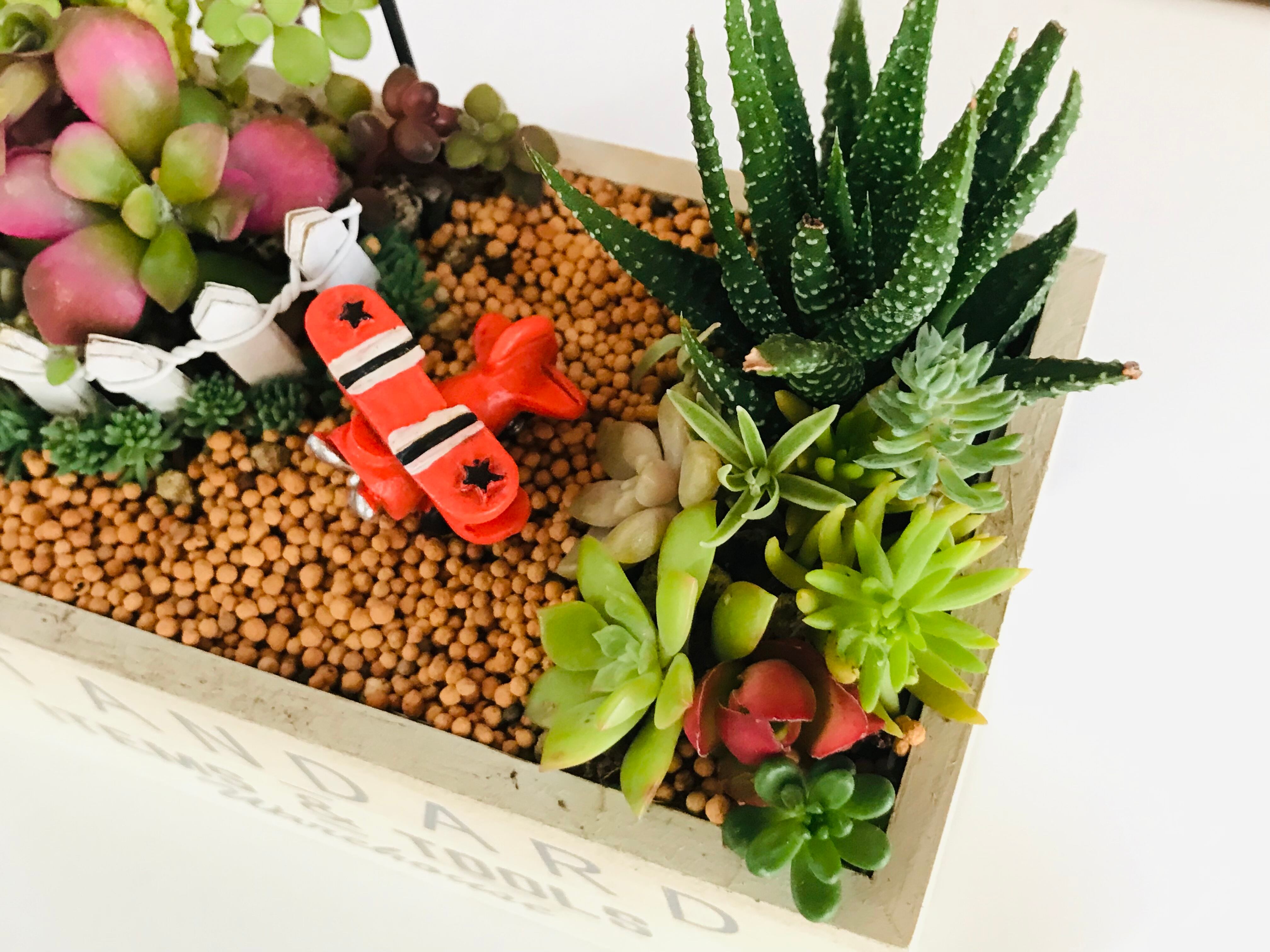 自家用飛行機のある景色を想像して作りました。水はけの良いように軽石を入れてあります。そこに穴もあけてあります。この小さな世界を窓辺にいかがですか?