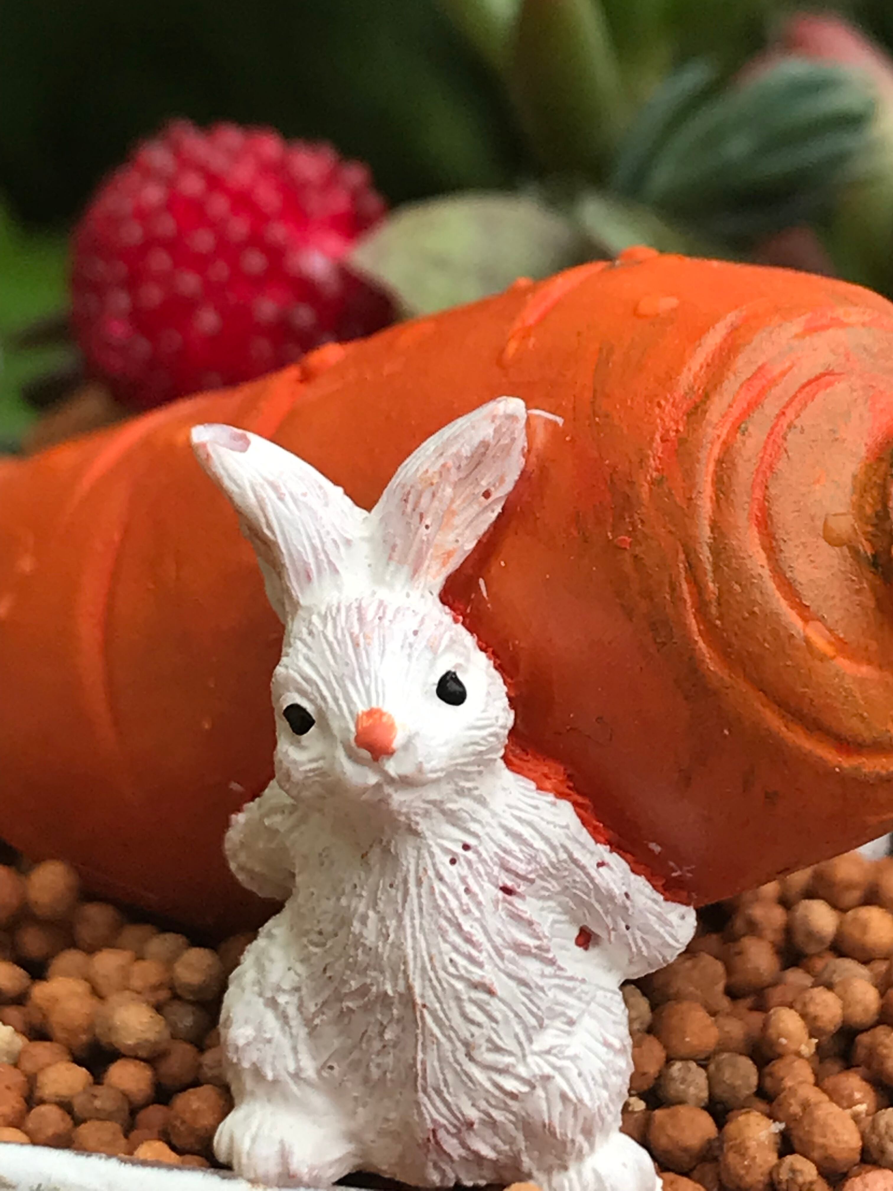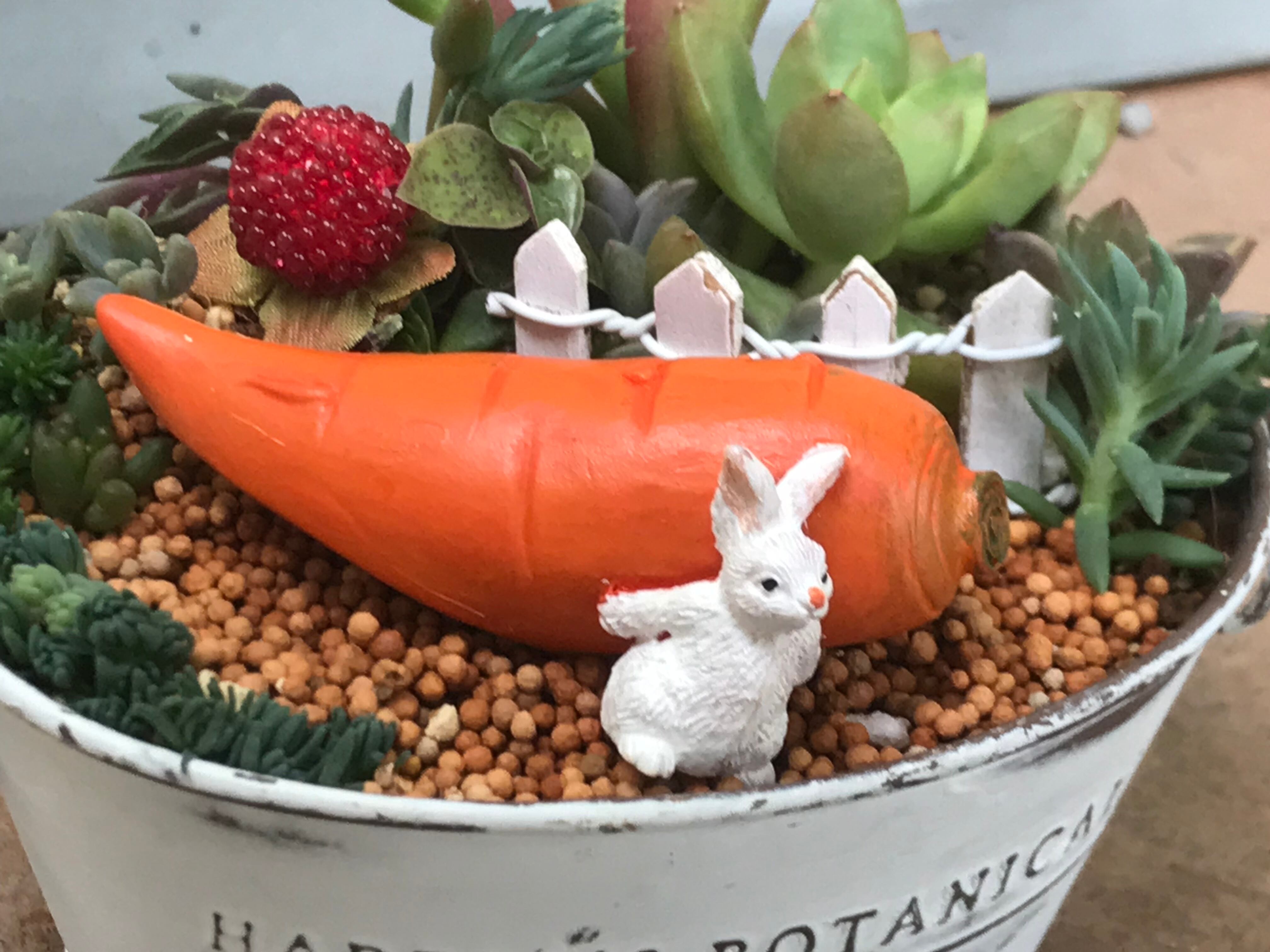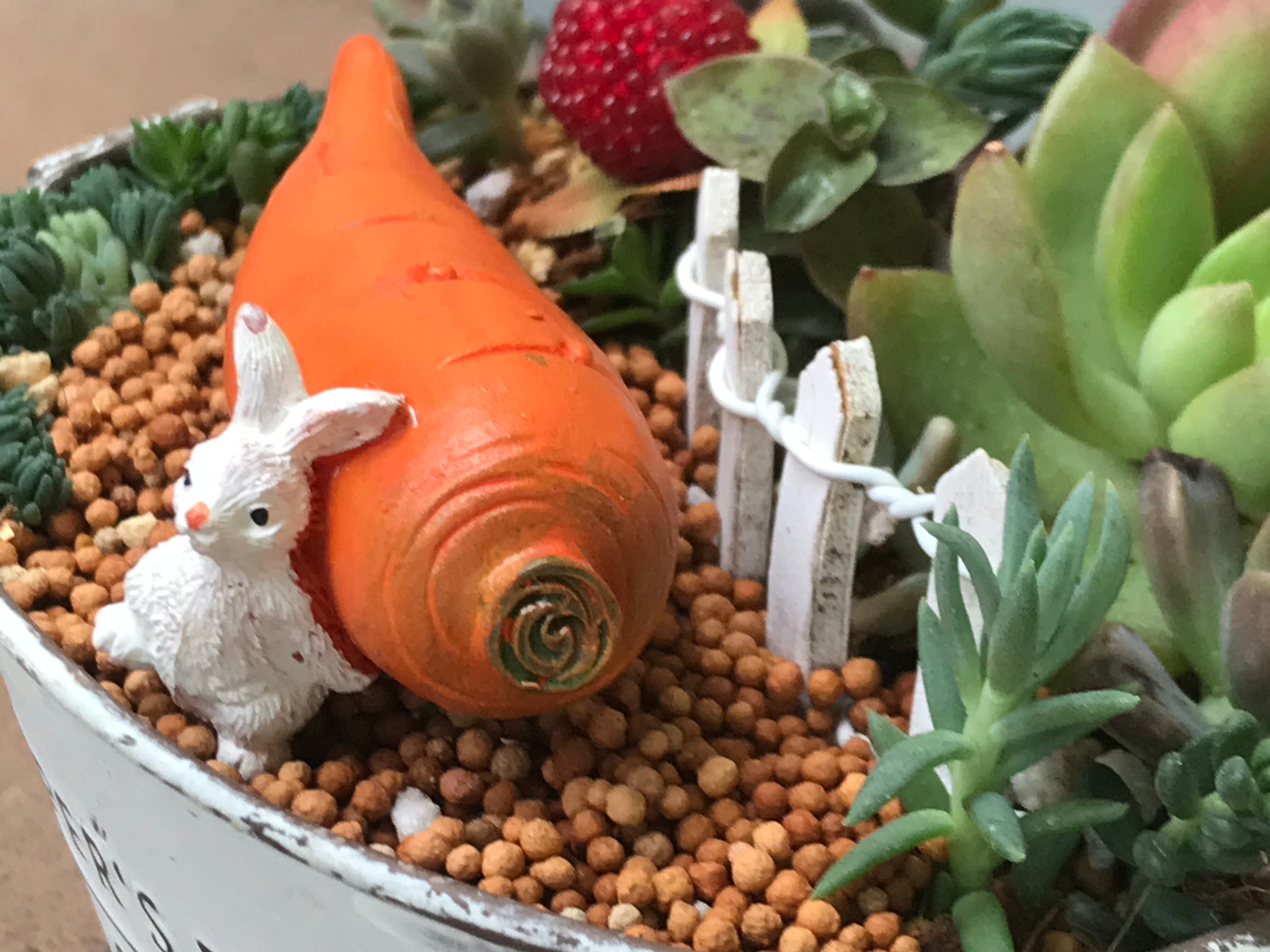 水はけが良くなるように半分は軽石が入っています。底に穴もあけてあります。また、通気性の良い観葉植物の土を使っています。うさぎがいる土の部分だけ固まる土を使い、土がこぼれないようにしてあります。