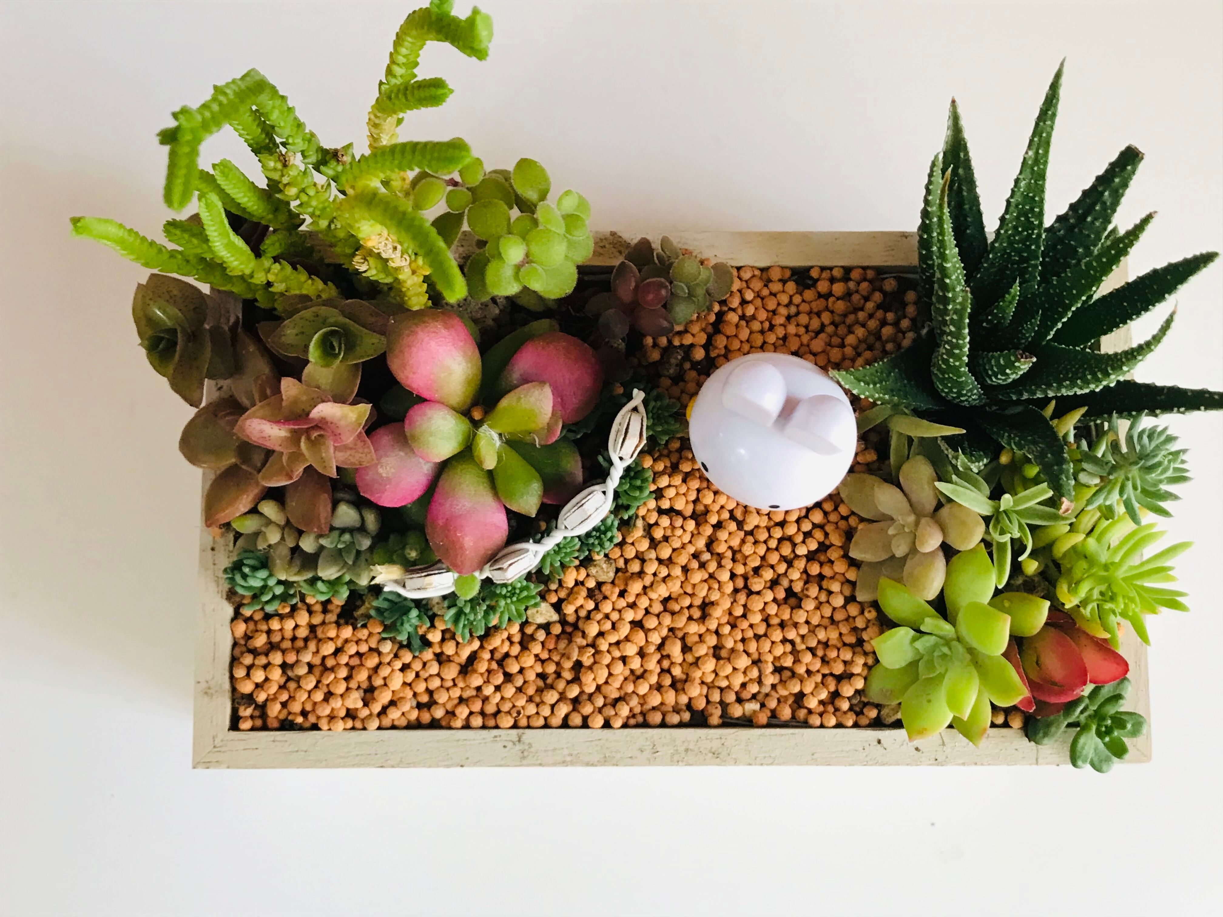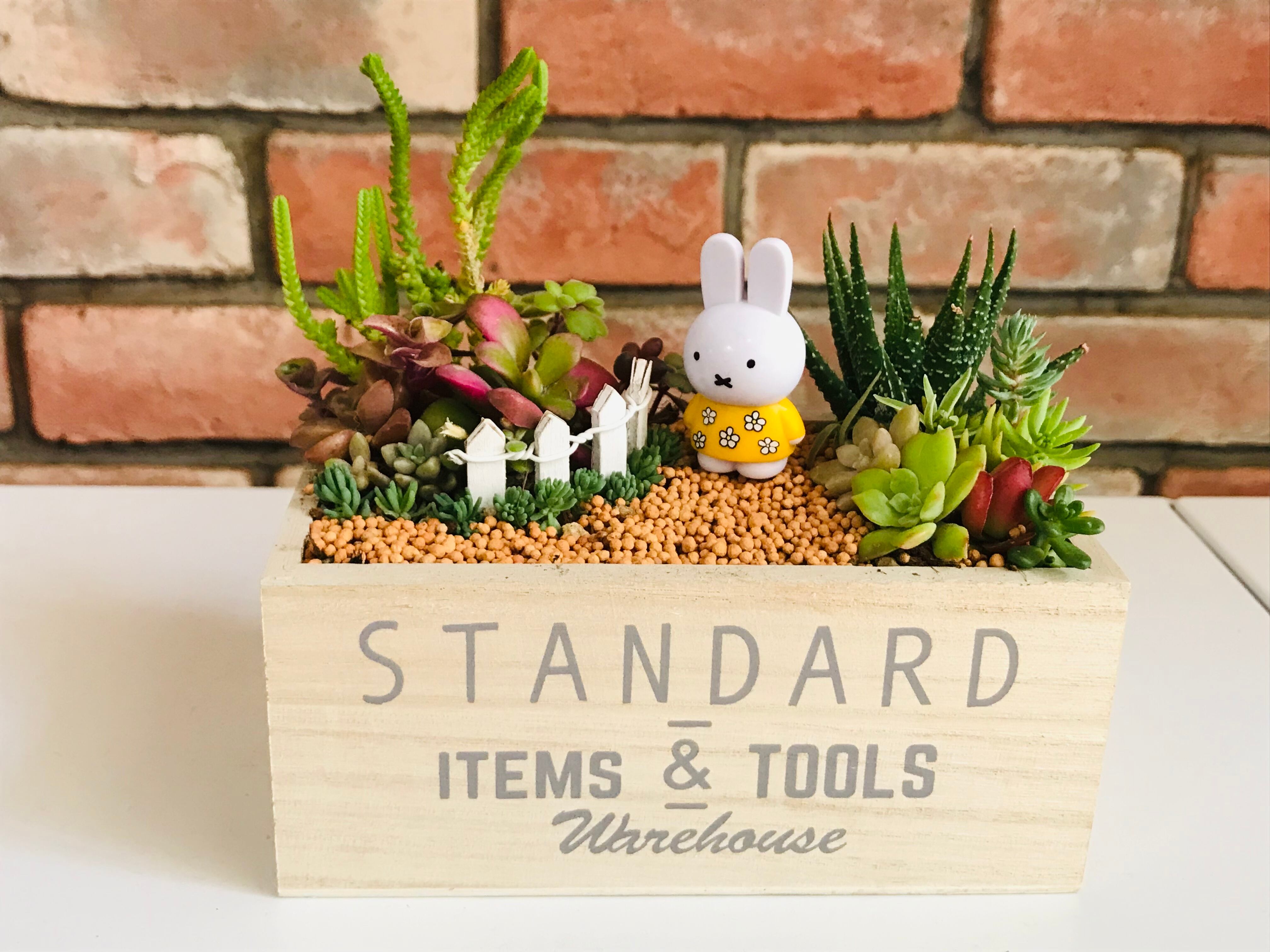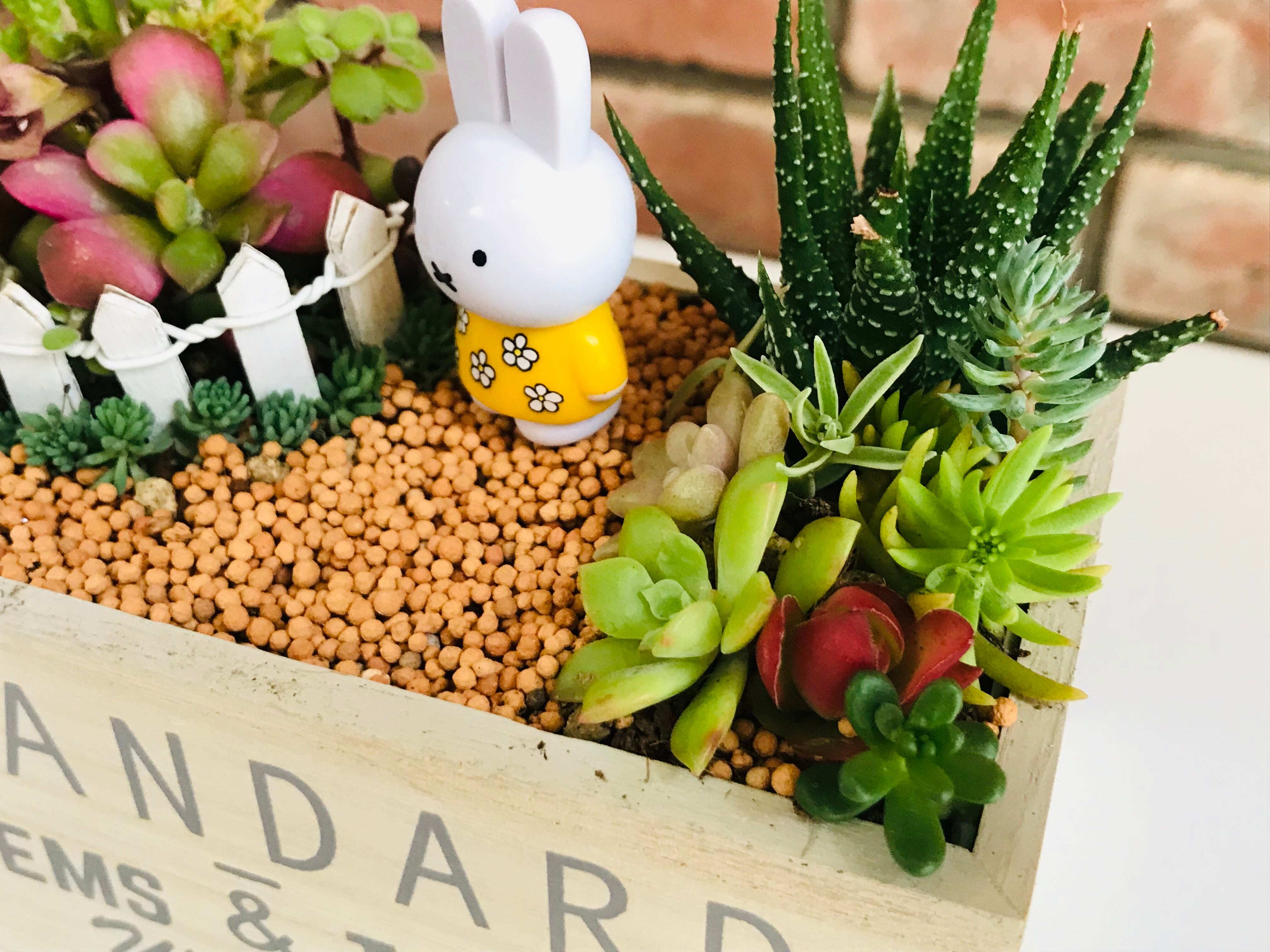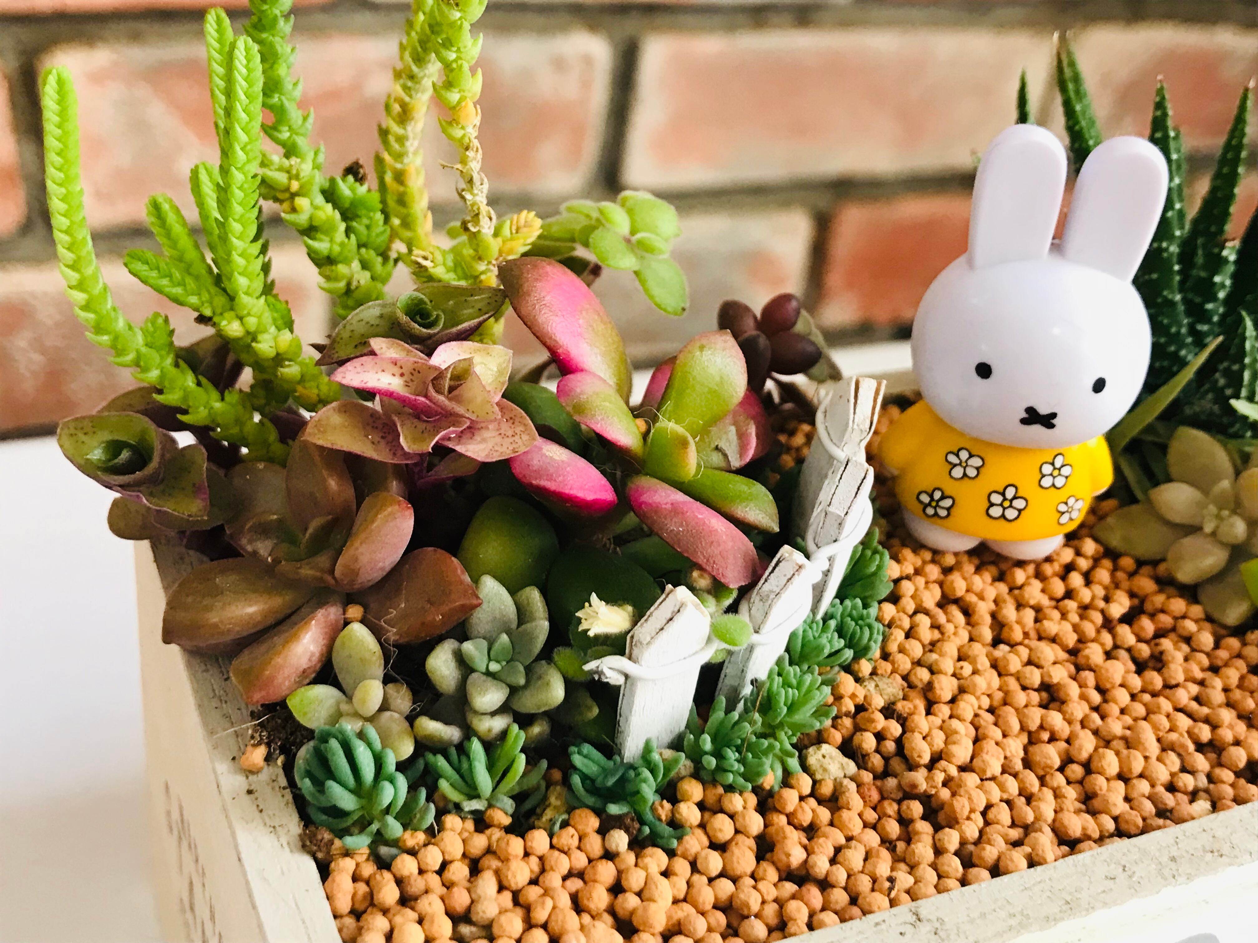 うさぎのマスコットを置いて、庭で遊ぶ様子を想像して作ってみました。土は、軽石、赤玉土、観葉植物用の土、細かい植え付け用の土、道の部分のみ固まる土を使用しております。害虫予防のためオルトランを配合しています。