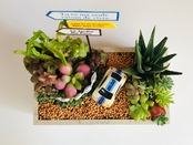 カリフォルニアをドライブするイメージで作ってみました。土は、軽石、赤玉土、観葉植物用の土、細かい植え付け用の土、道の部分のみ固まる土を使用しております。害虫予防のためオルトランを配合しています。
