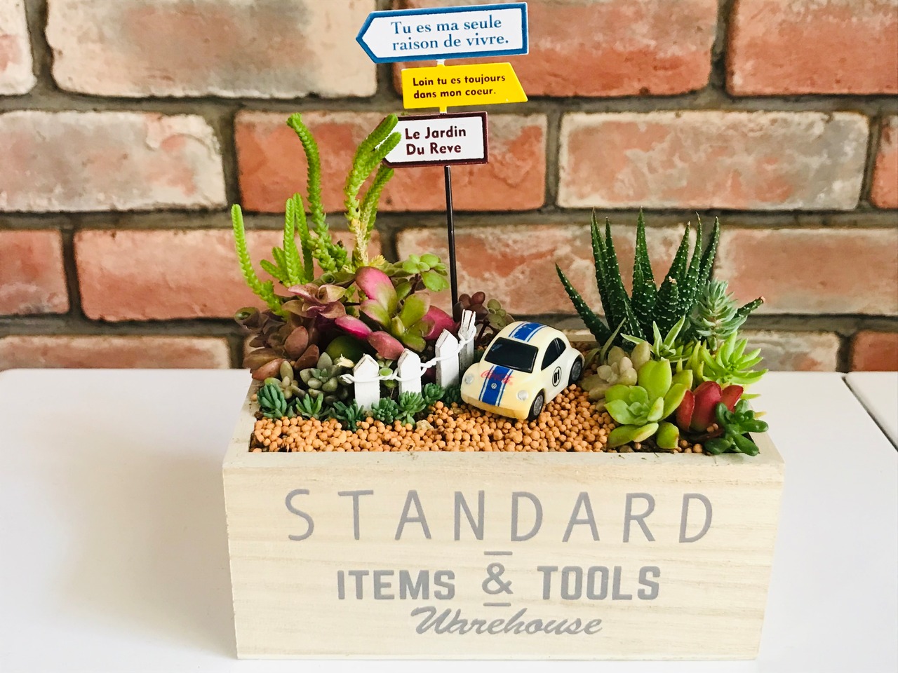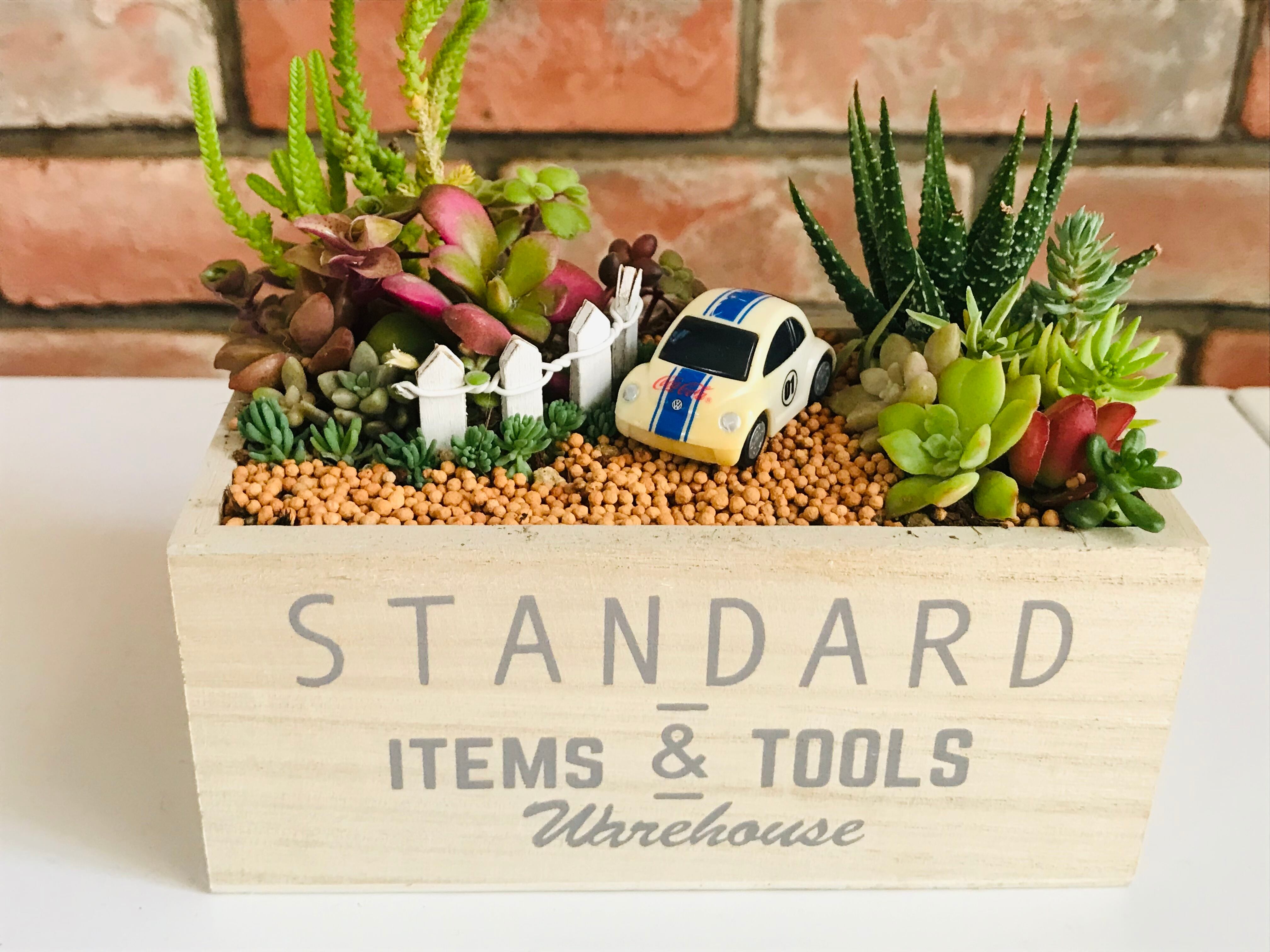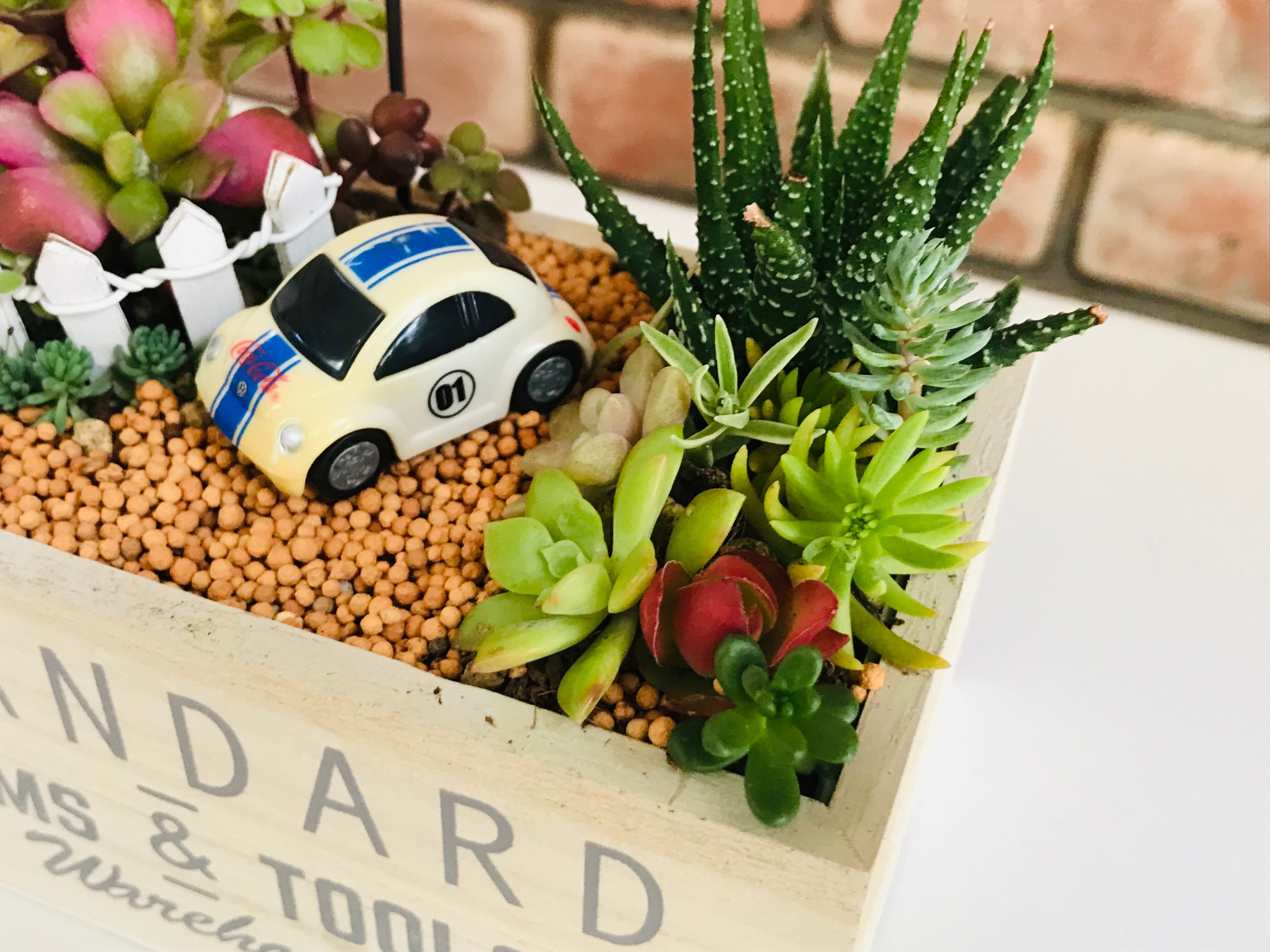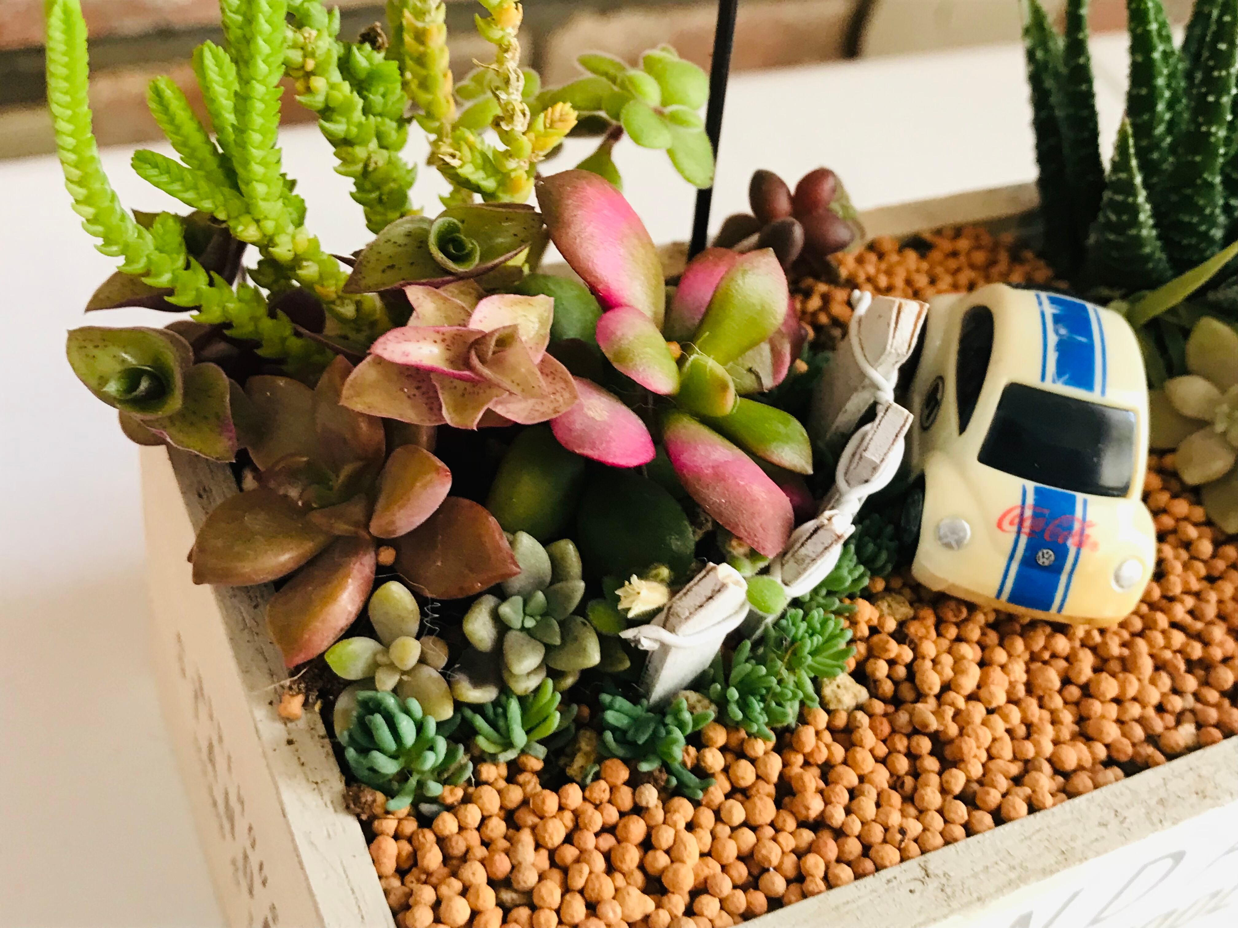 白い車でドライブ(多肉植物寄せ植え)