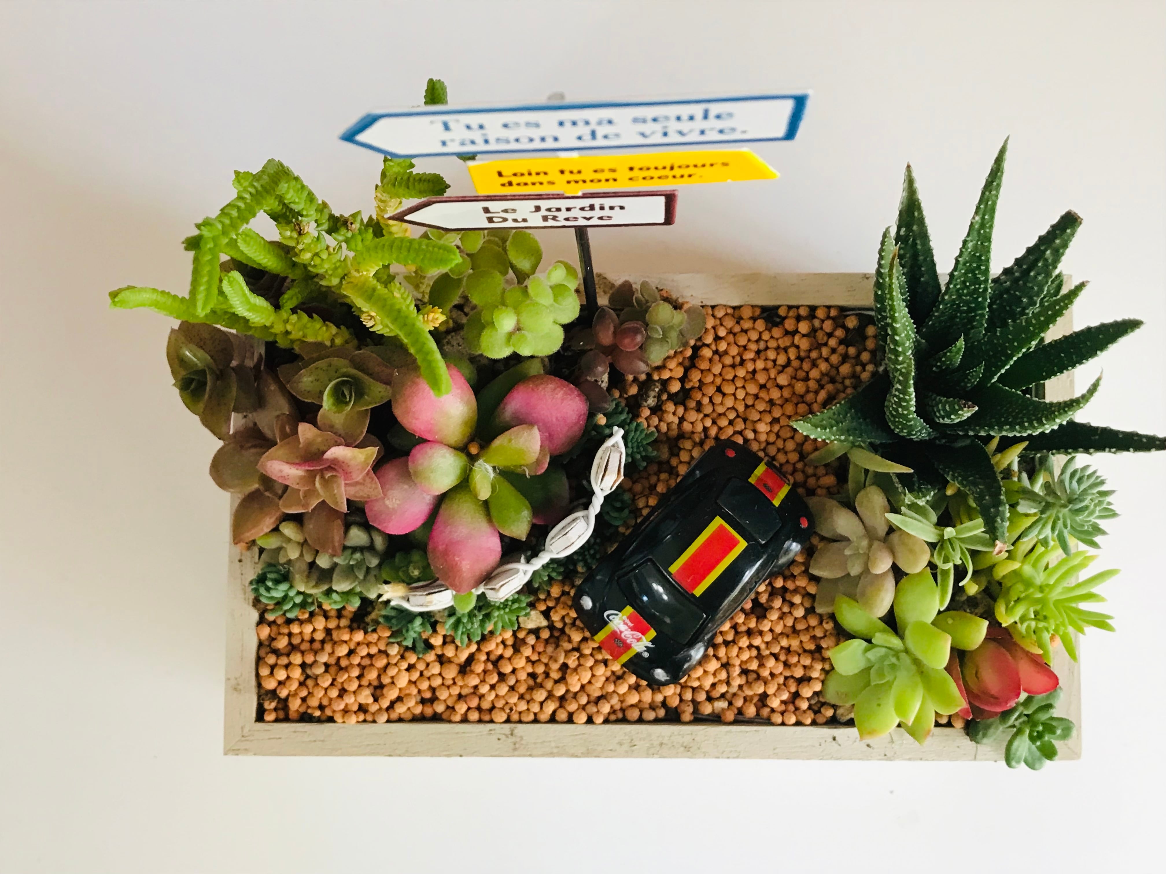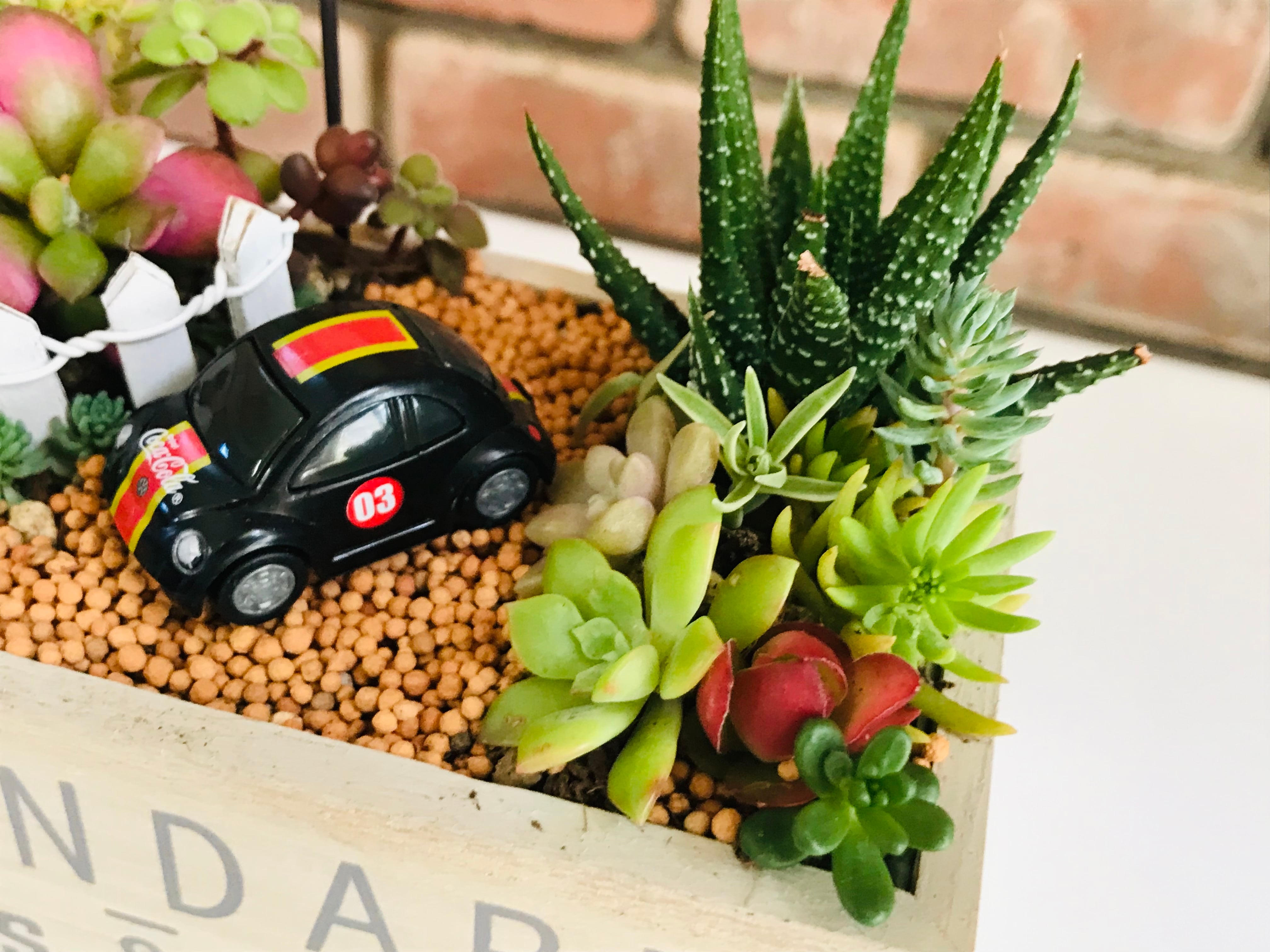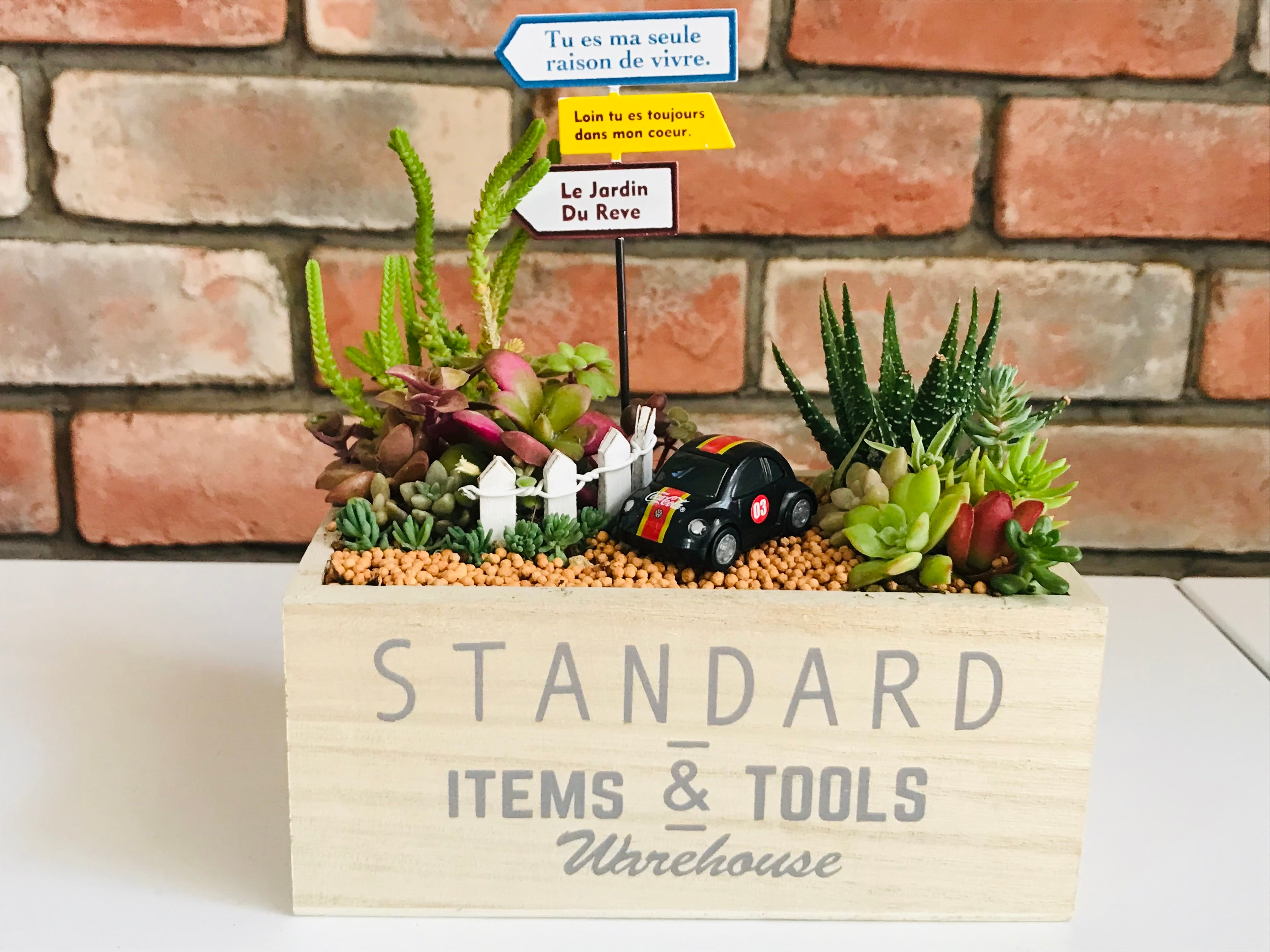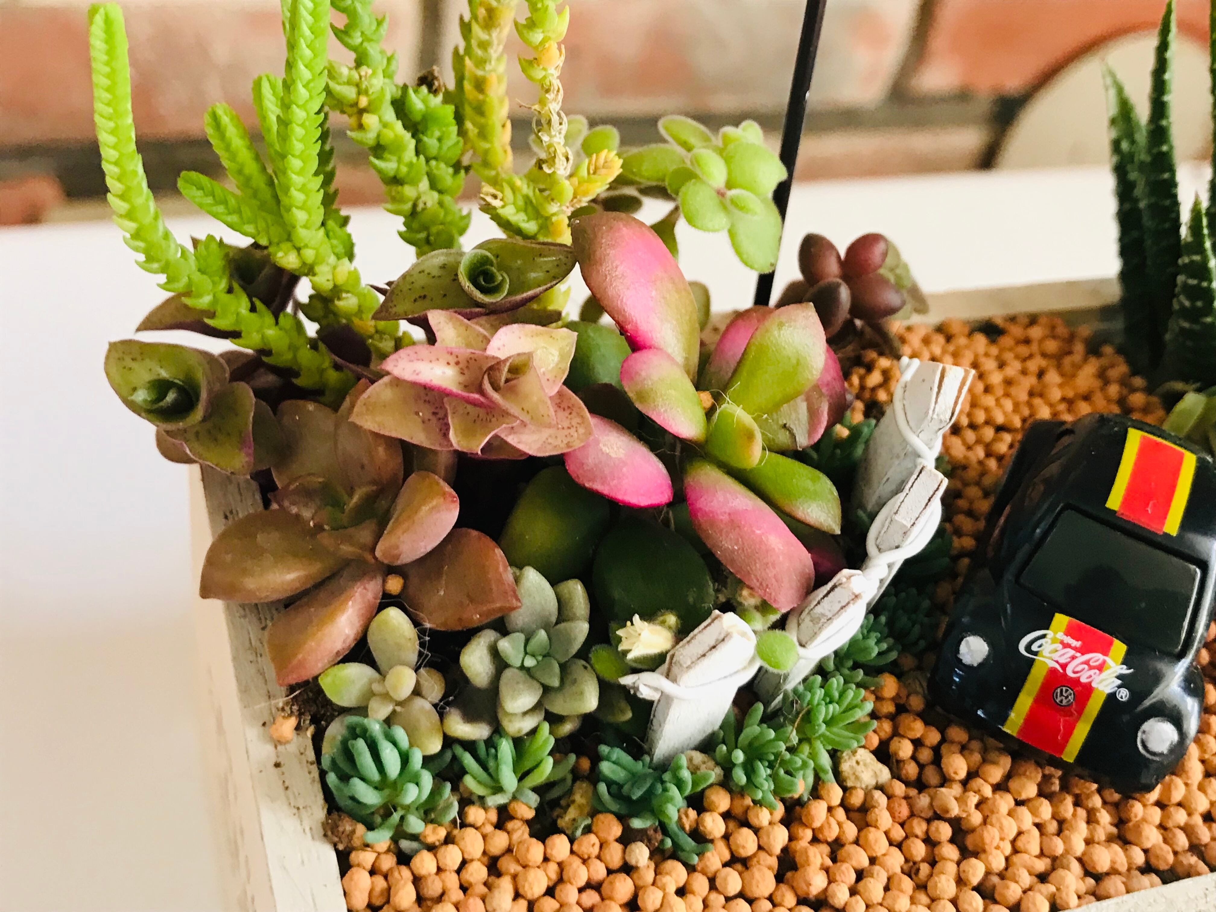 カリフォルニアをドライブするイメージで作ってみました。土は、軽石、赤玉土、観葉植物用の土、細かい植え付け用の土、道の部分のみ固まる土を使用しております。害虫予防のためオルトランを配合しています。