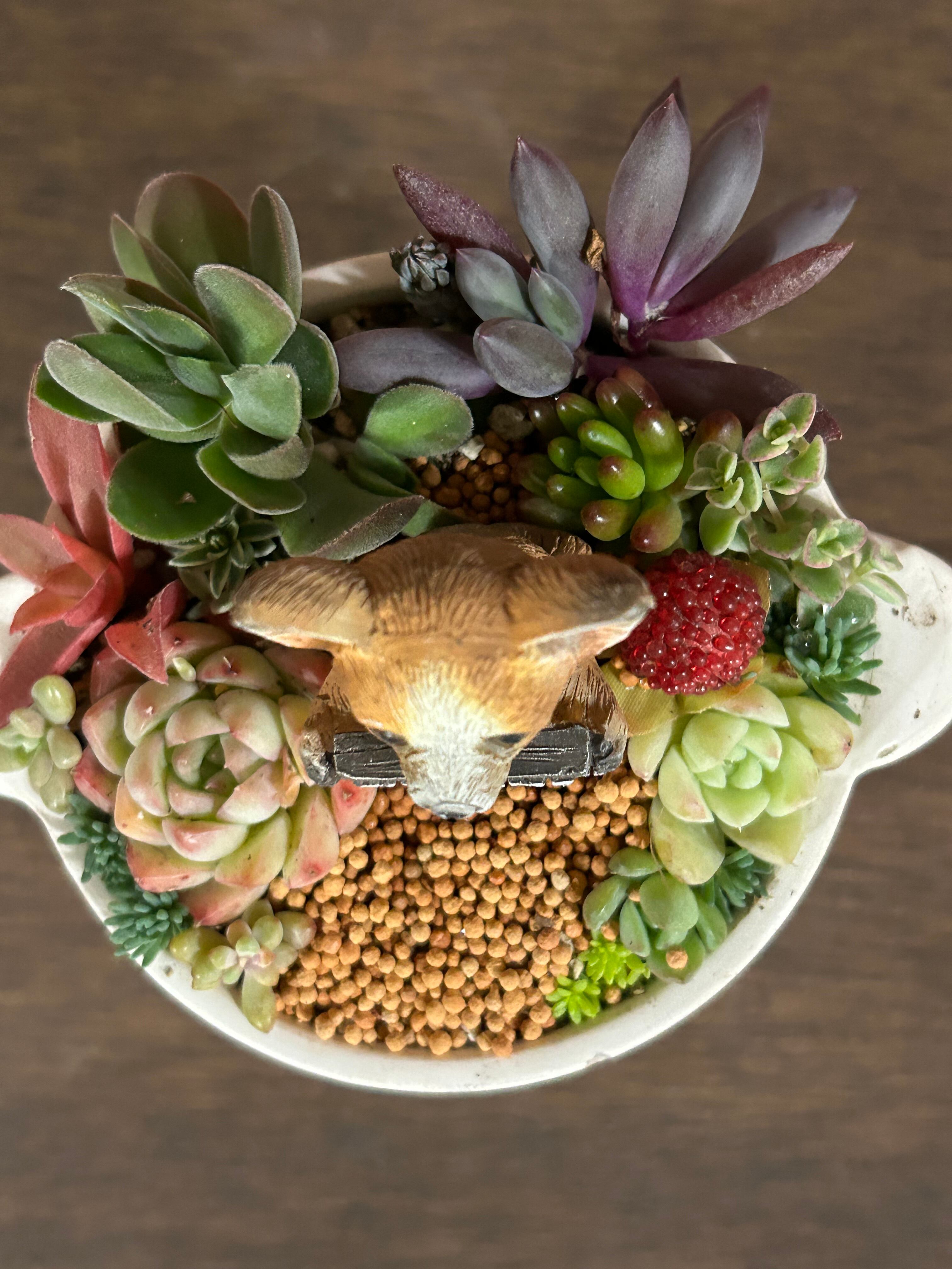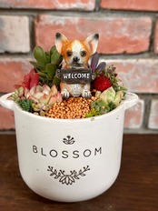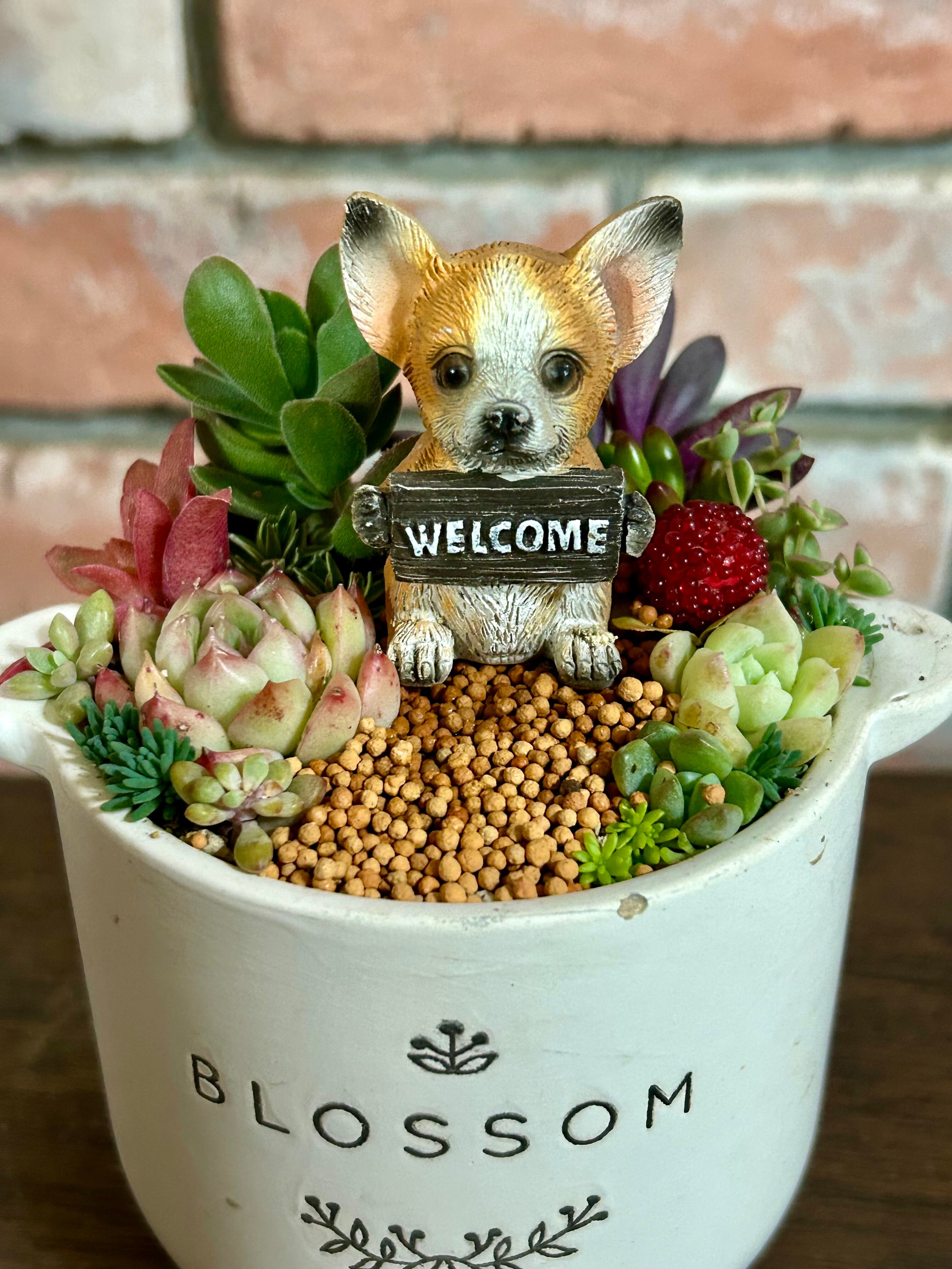 色々な種類の多肉植物を入れてカラフルに寄せ植えしました。玄関や机上、窓辺等において、パピヨンがお出迎え。