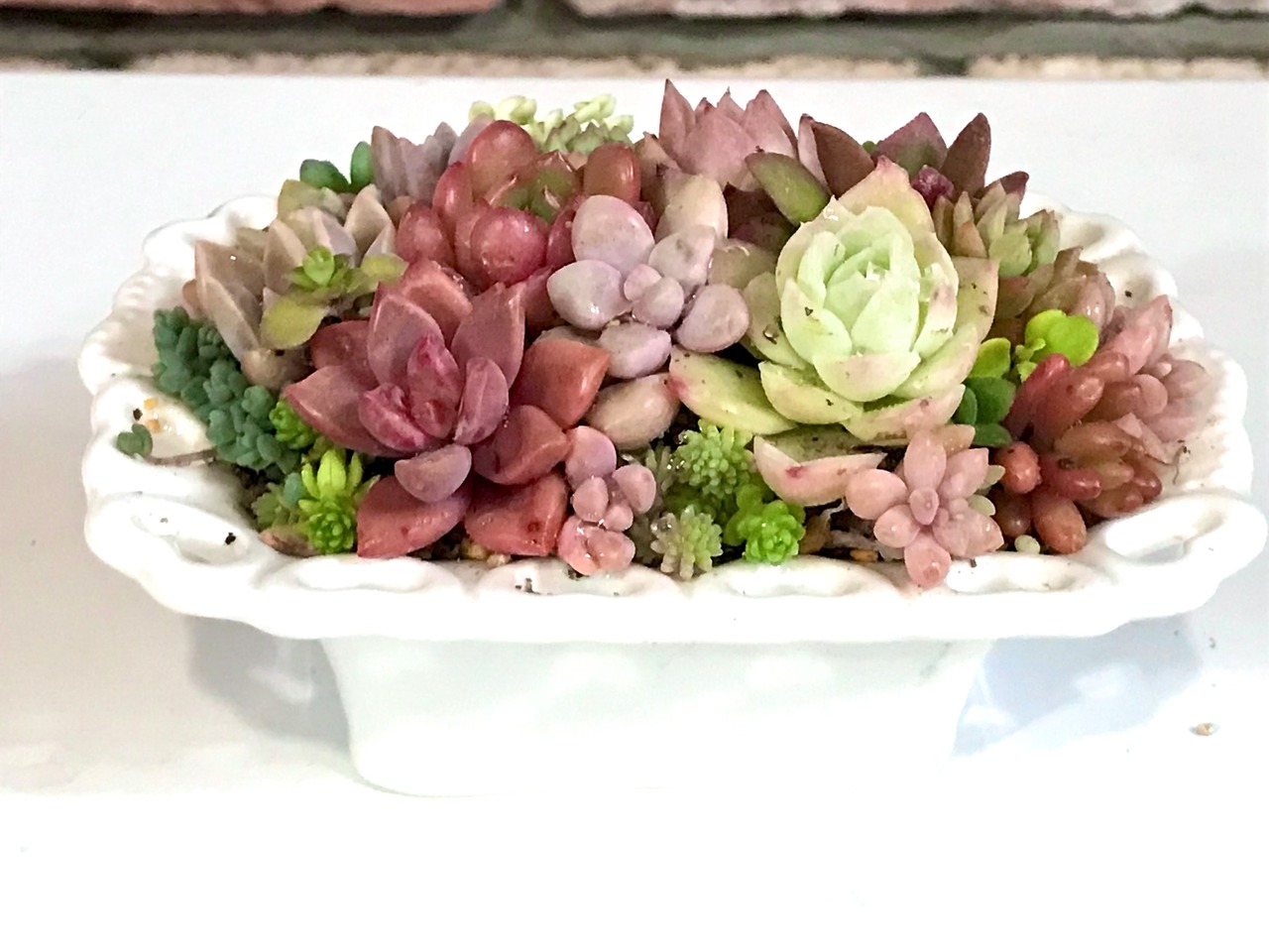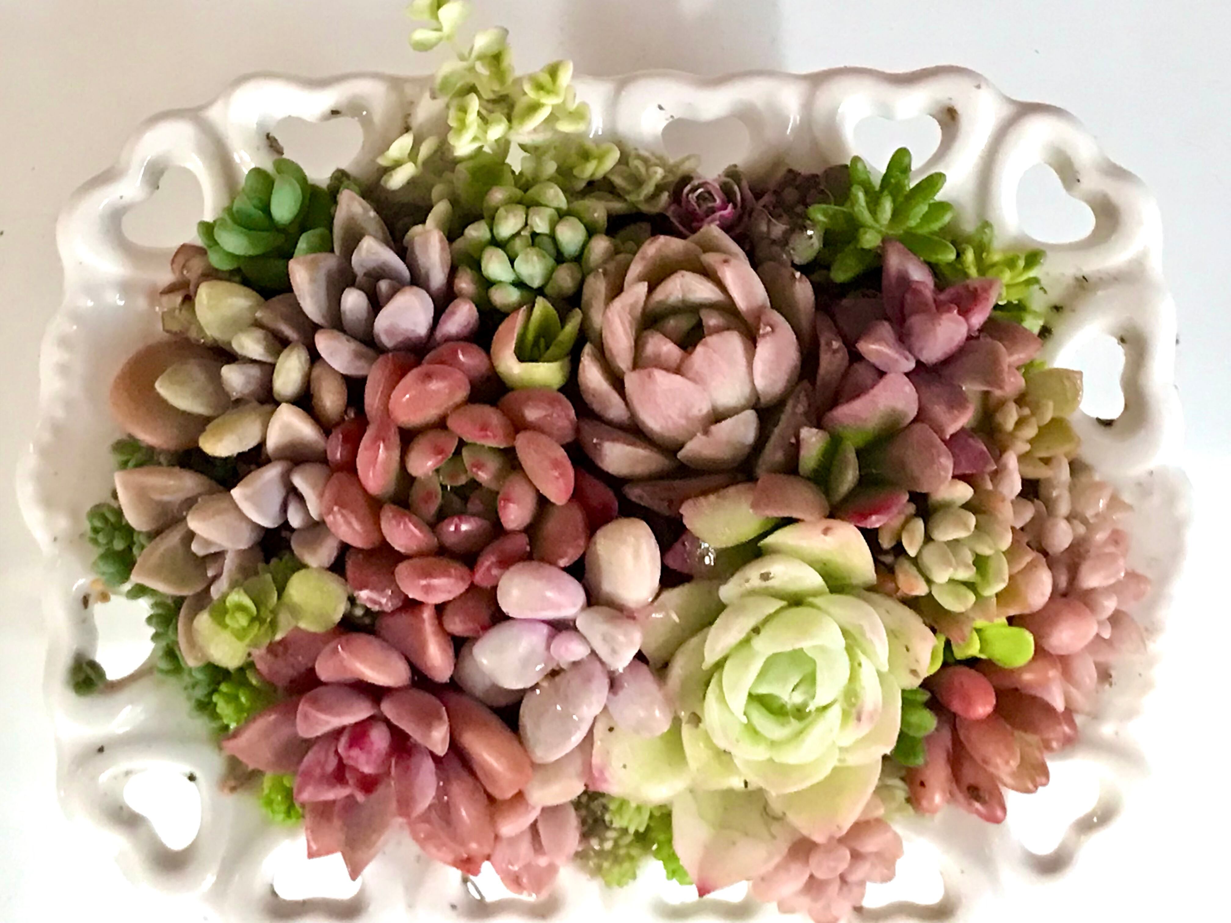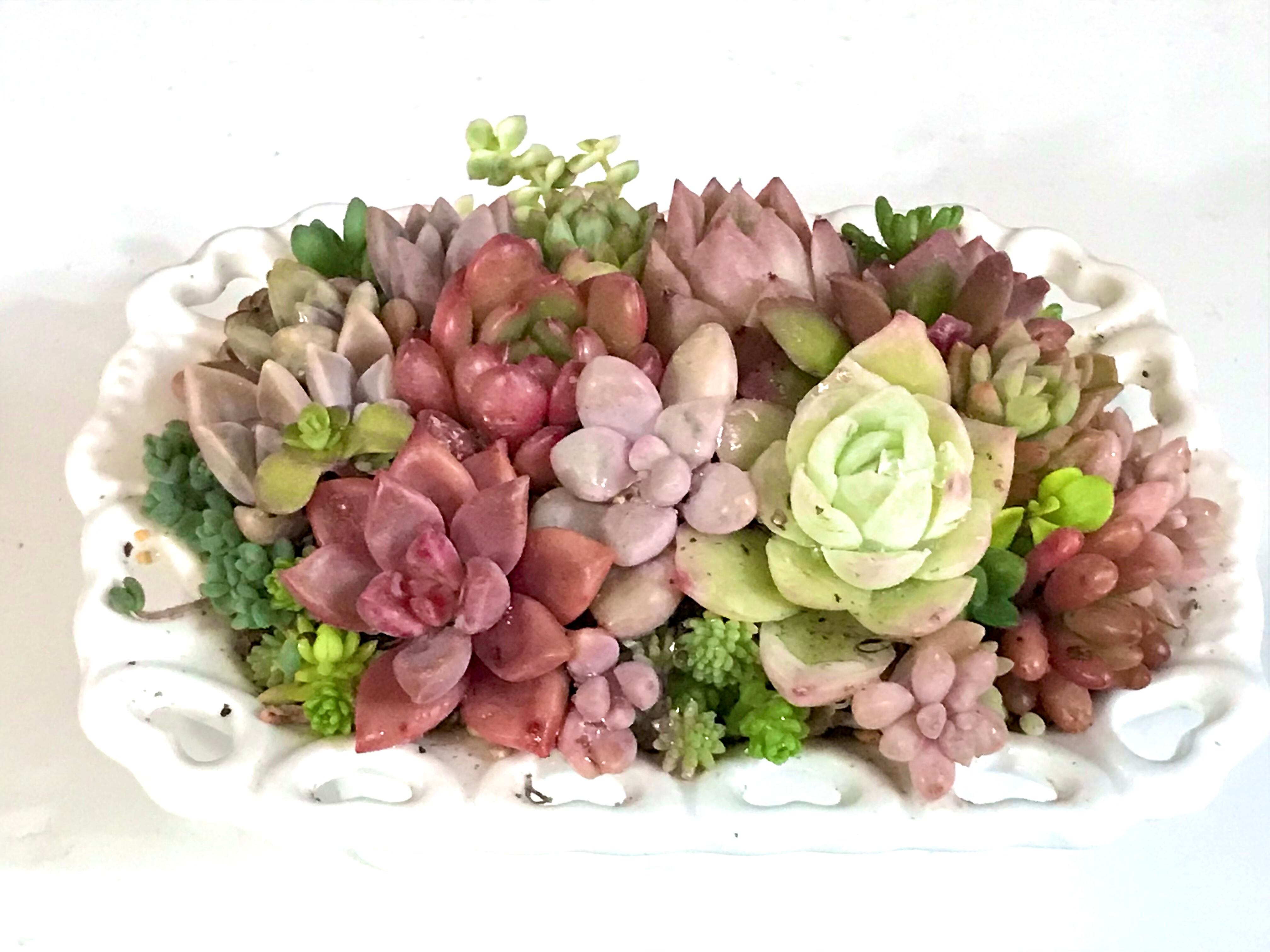 レース模様のプレートによせうえしてみました。軽石を入れ水はけ良くしてあります。できるだけ多くの種類の苗を入れてみました。これから新緑の色に変化していくので楽しめると思います。簡単なお世話の仕方の説明書をお付けします。