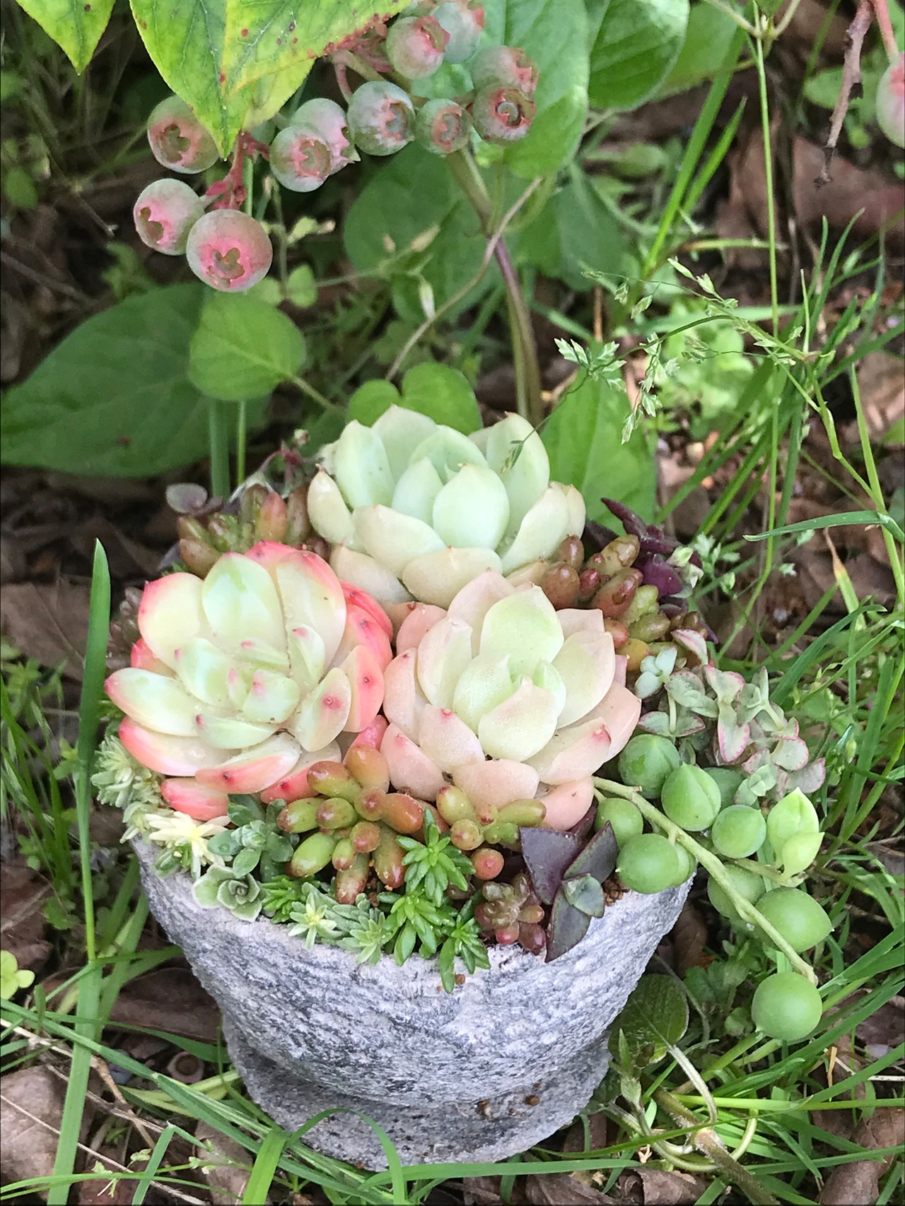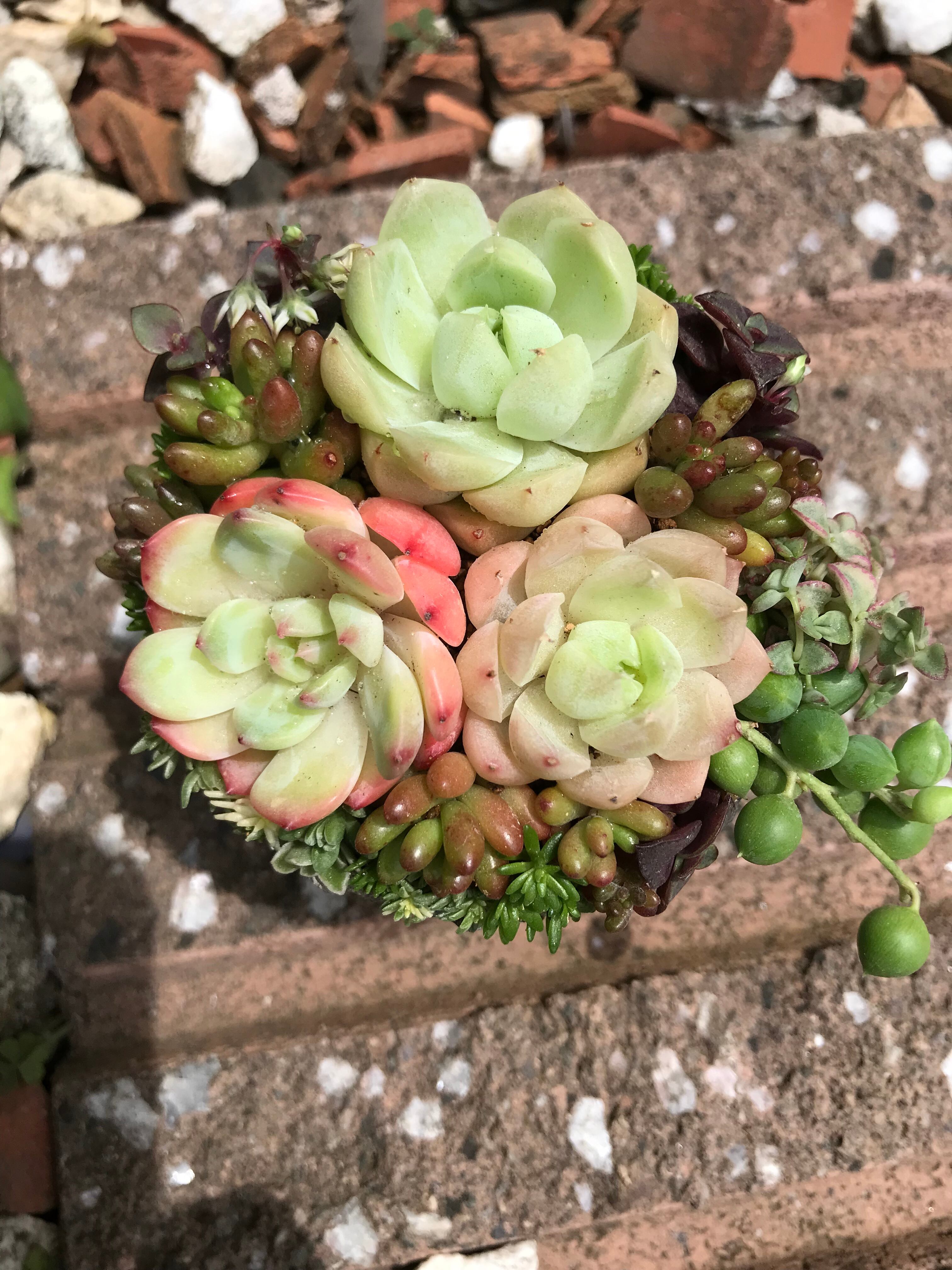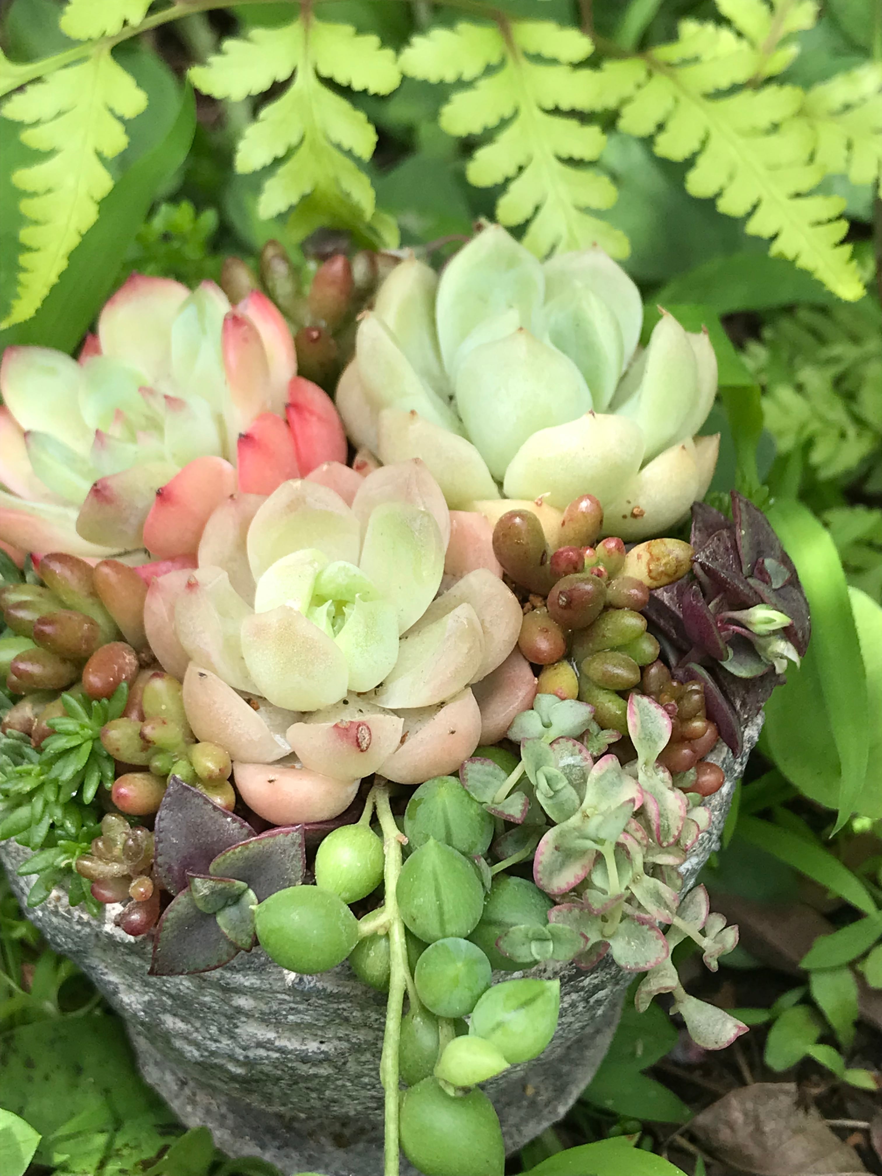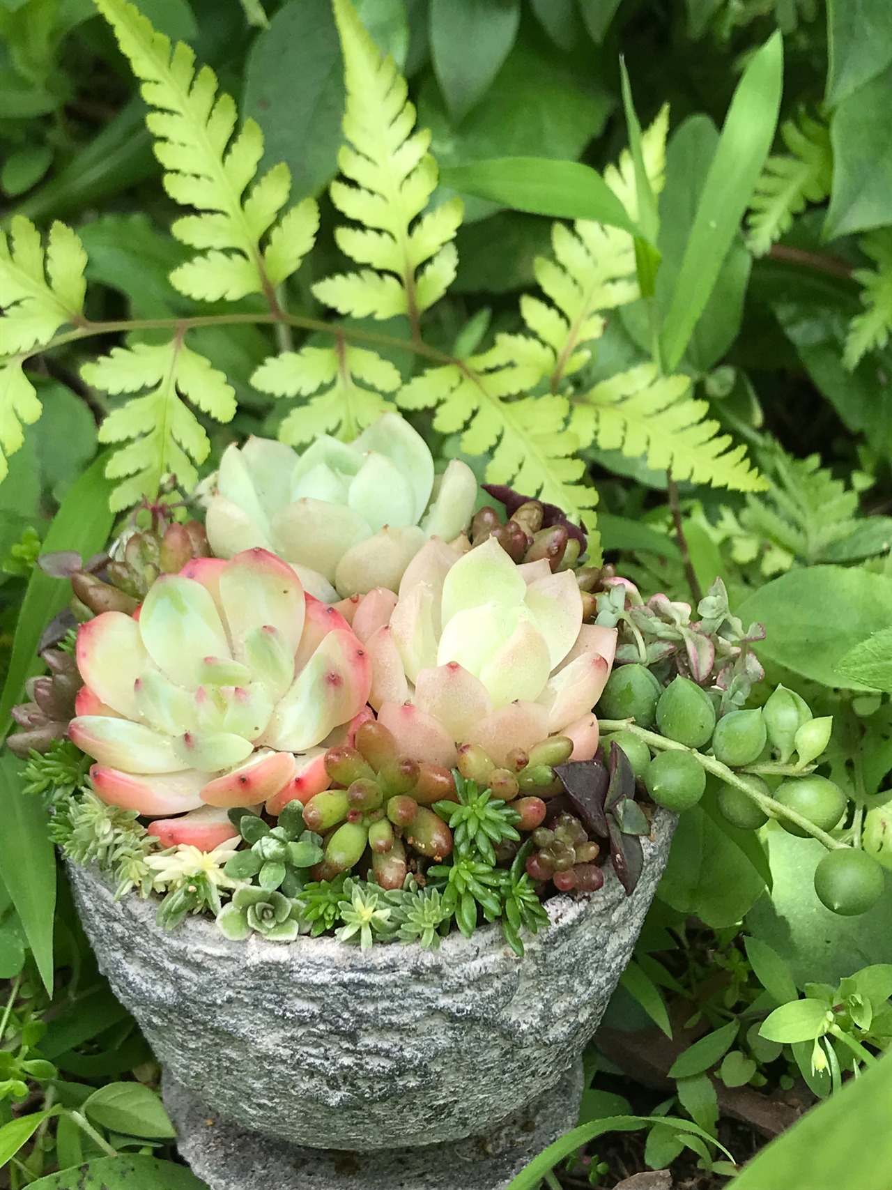 一見弱そうな印象を与えるこちらの多肉植物、意外にも丈夫で、特に水やりに関しては強い生命力を持っています。直射日光は避け、日陰や半日陰の場所で育てるのが理想的です。寄せ植えの中でも軽いので、移動もしやすく、お手入れも簡単です。