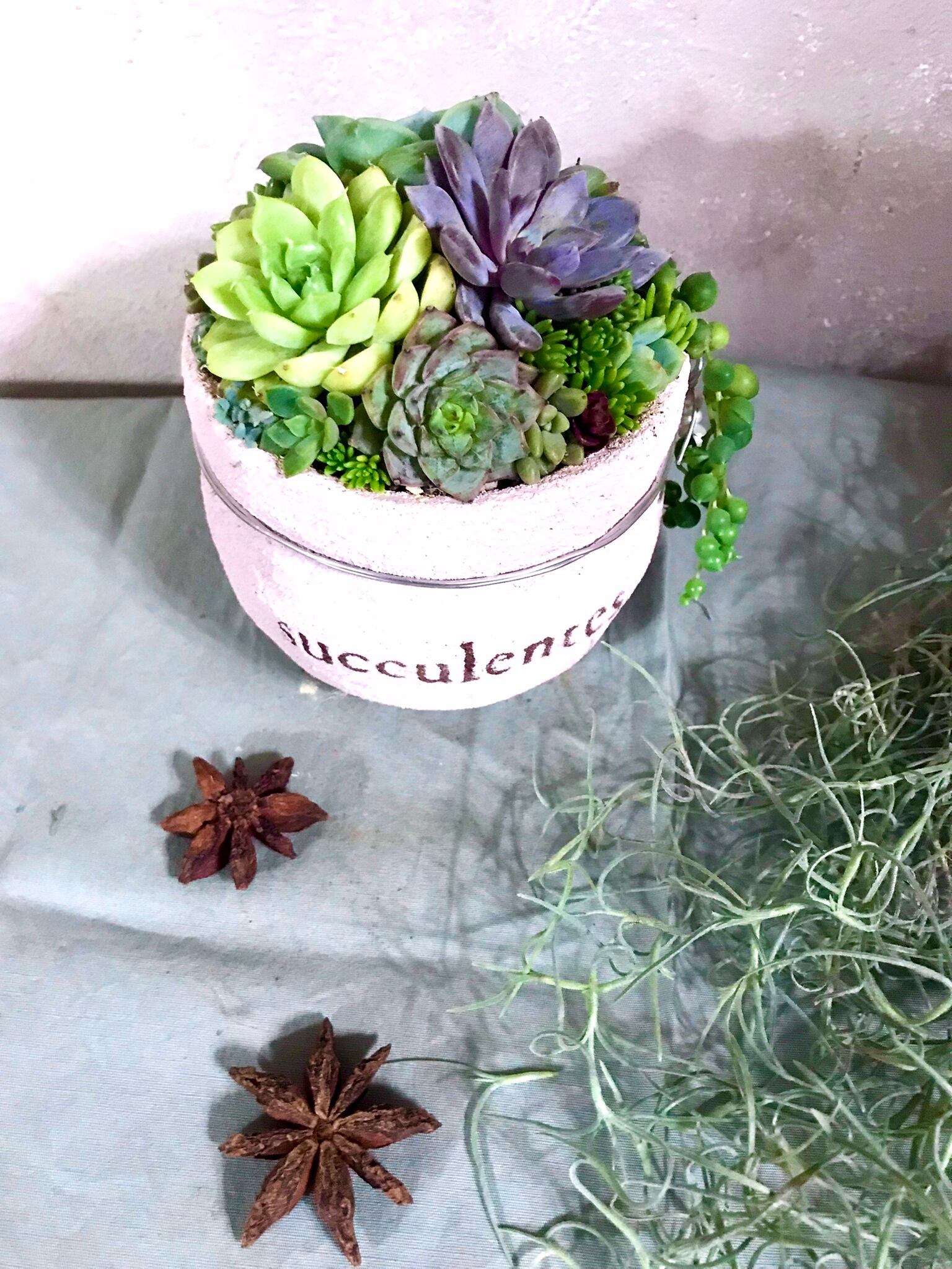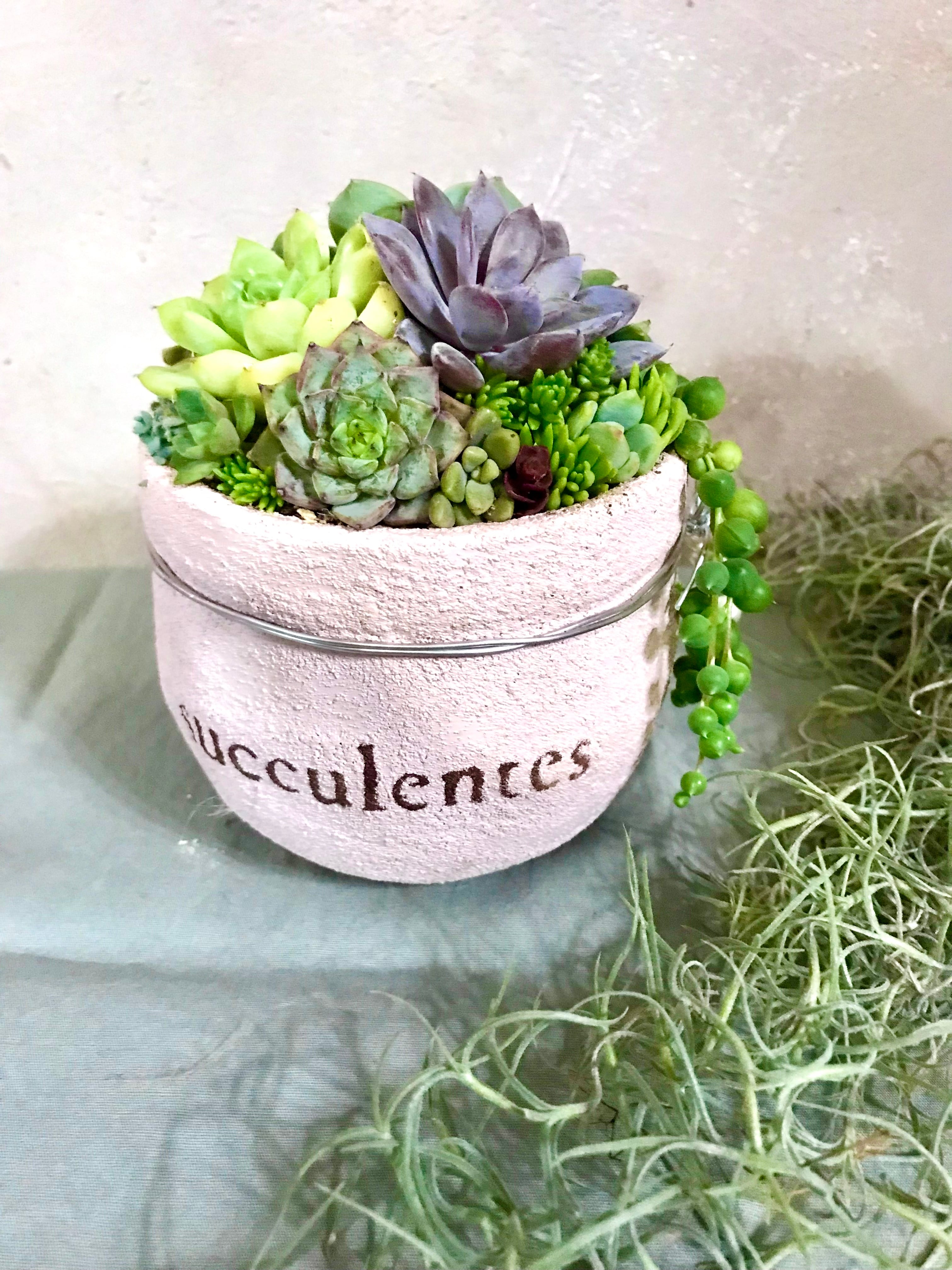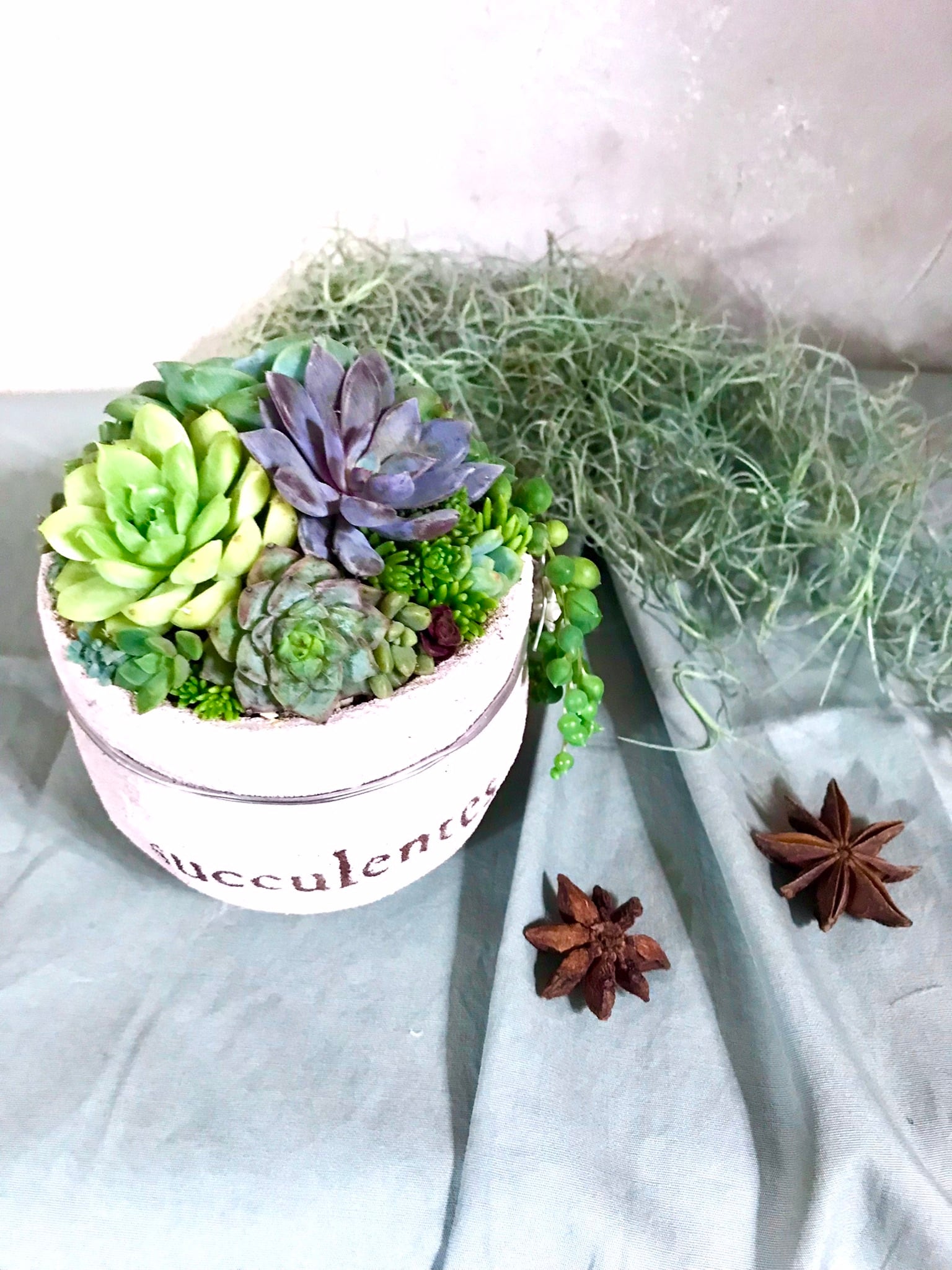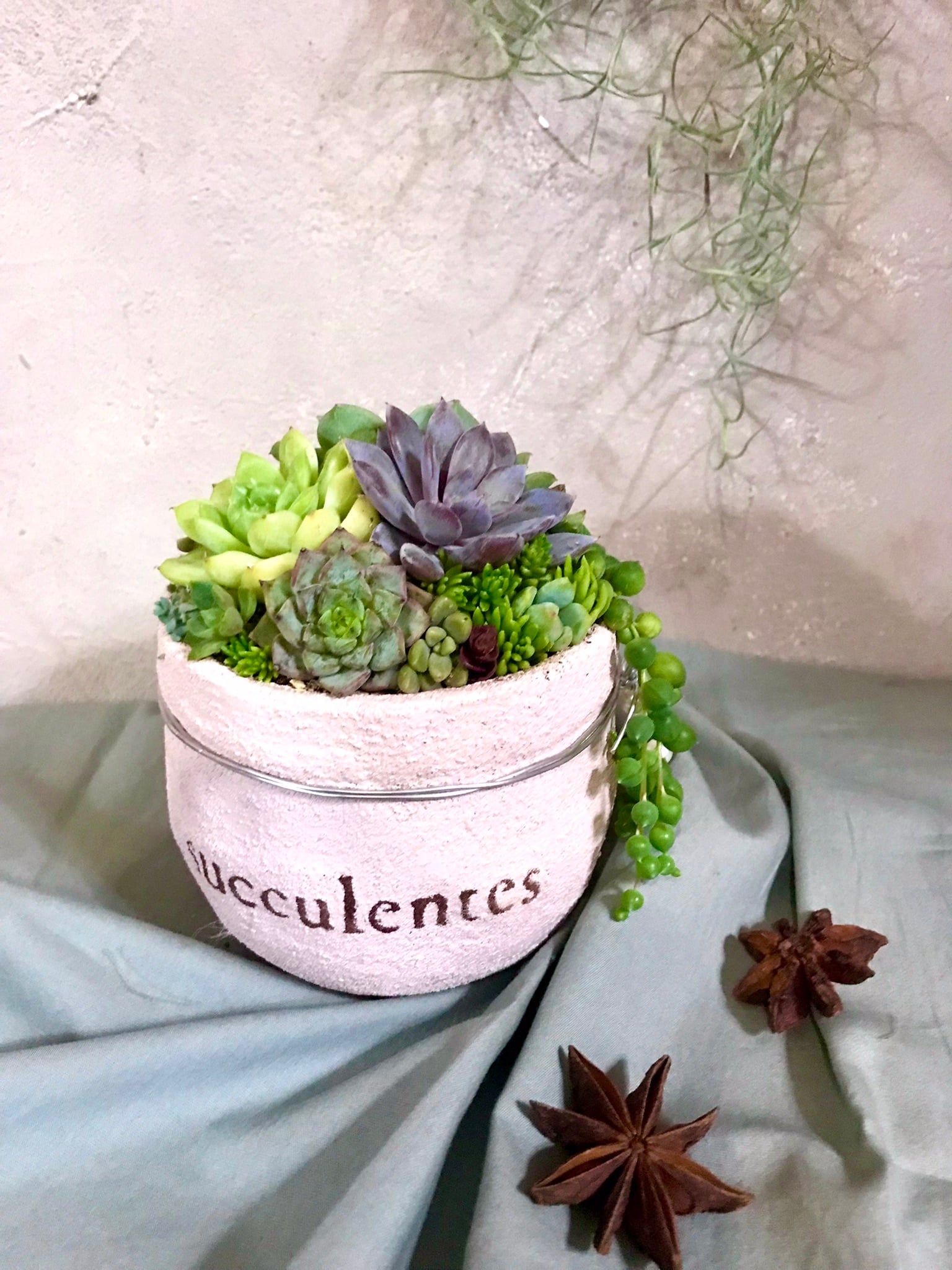 心地良い空間と癒しの時間をお届けする多肉植物寄せ植え(コロン鉢)。自宅やオフィス、ギフト用にもぜひご利用ください。