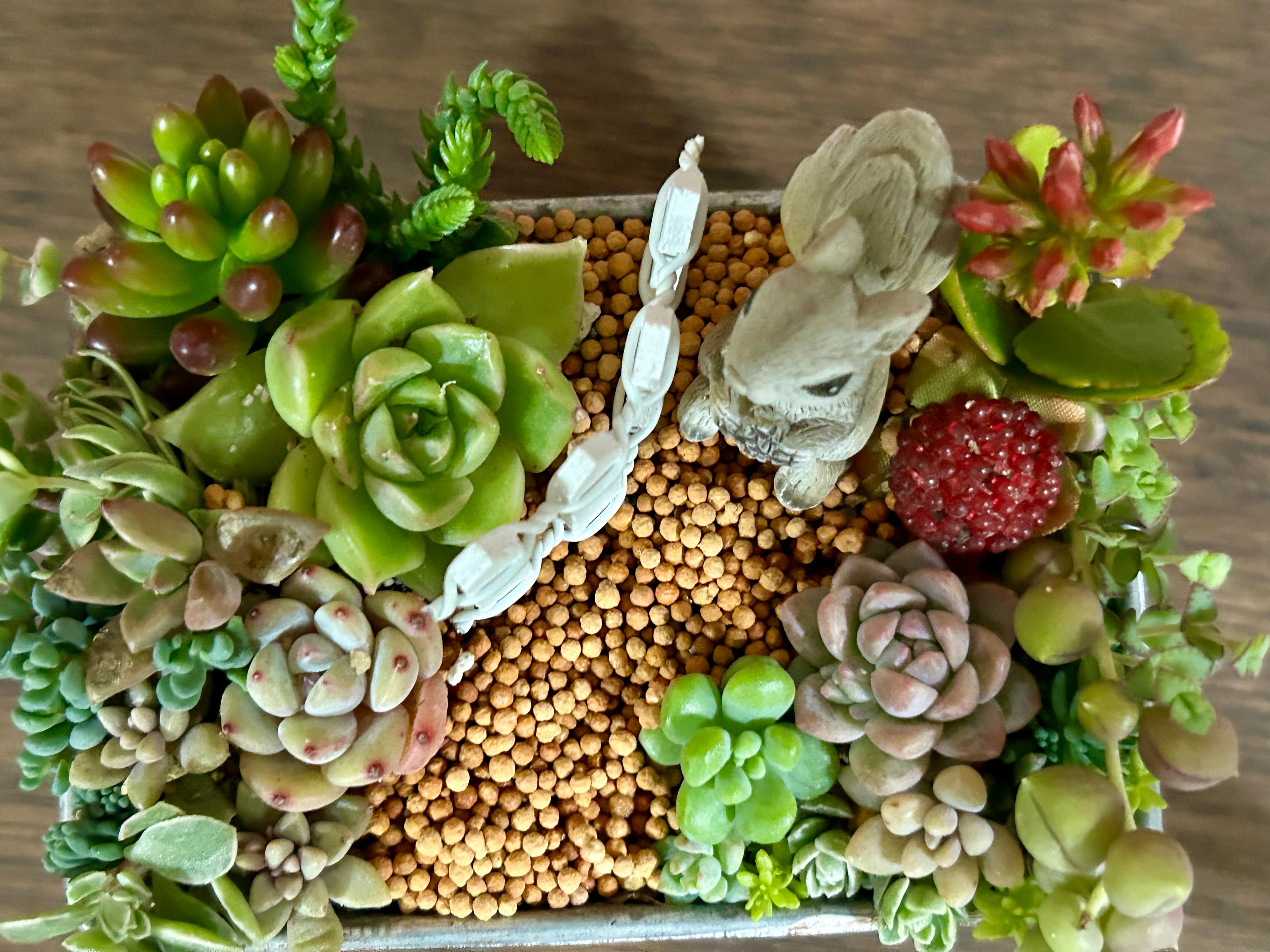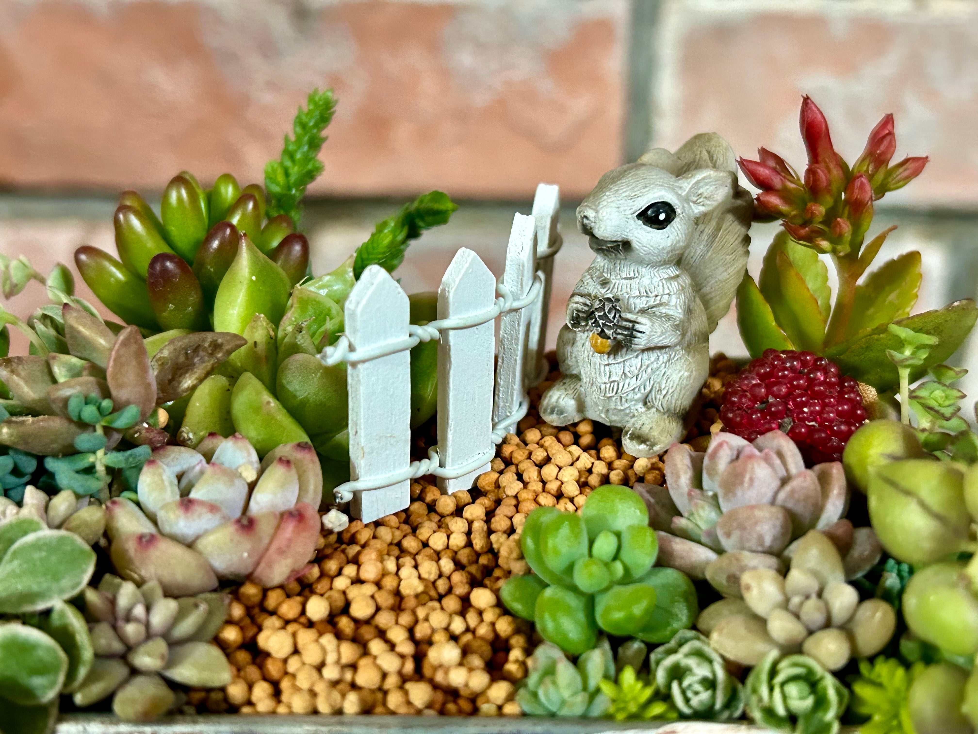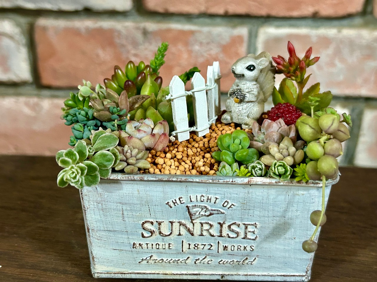 リスの散歩をする可愛らしい多肉植物寄せ植えです。小さなリスのオブジェが植物に寄り添ってお散歩している様子がとってもキュート。癒しの空間を演出するインテリアアイテムとしてもおすすめです。