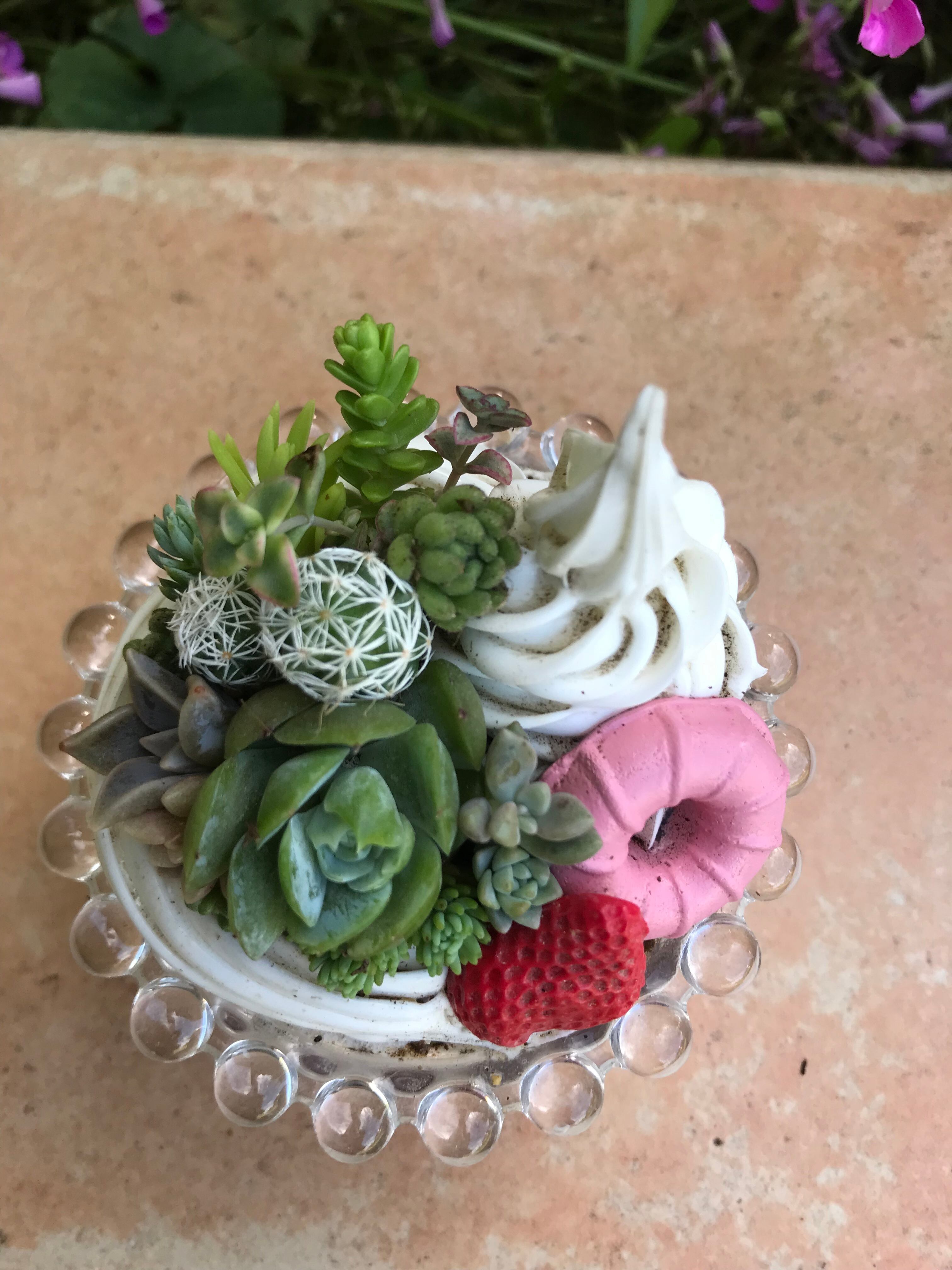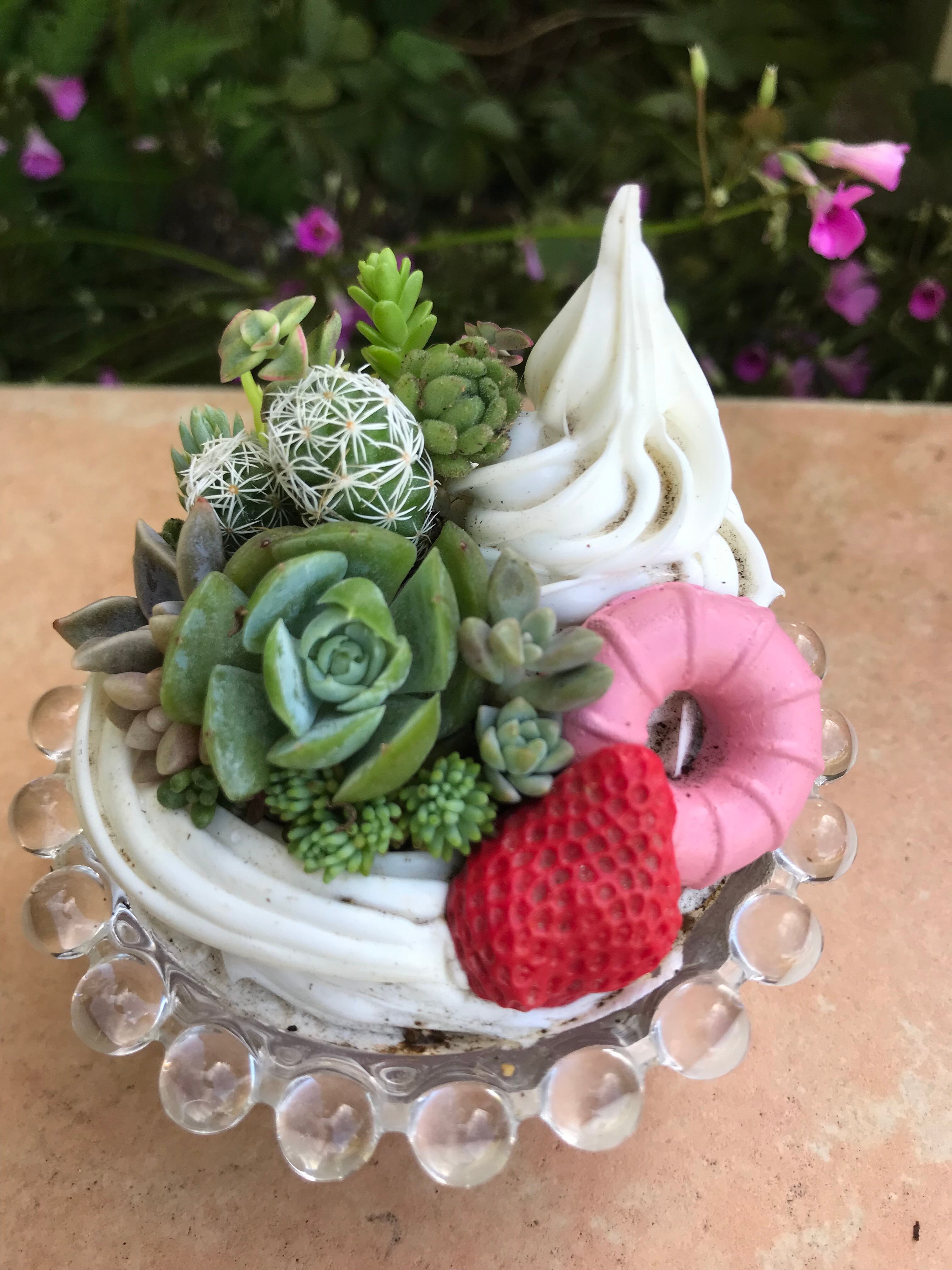 「ケーキ」の製作には、厳選された健康な多肉植物を使用しています。育てやすく、水やりの頻度も少ないので初心者の方にもおすすめです。また、陶器の鉢に植えられているため、長くお楽しみいただけます。