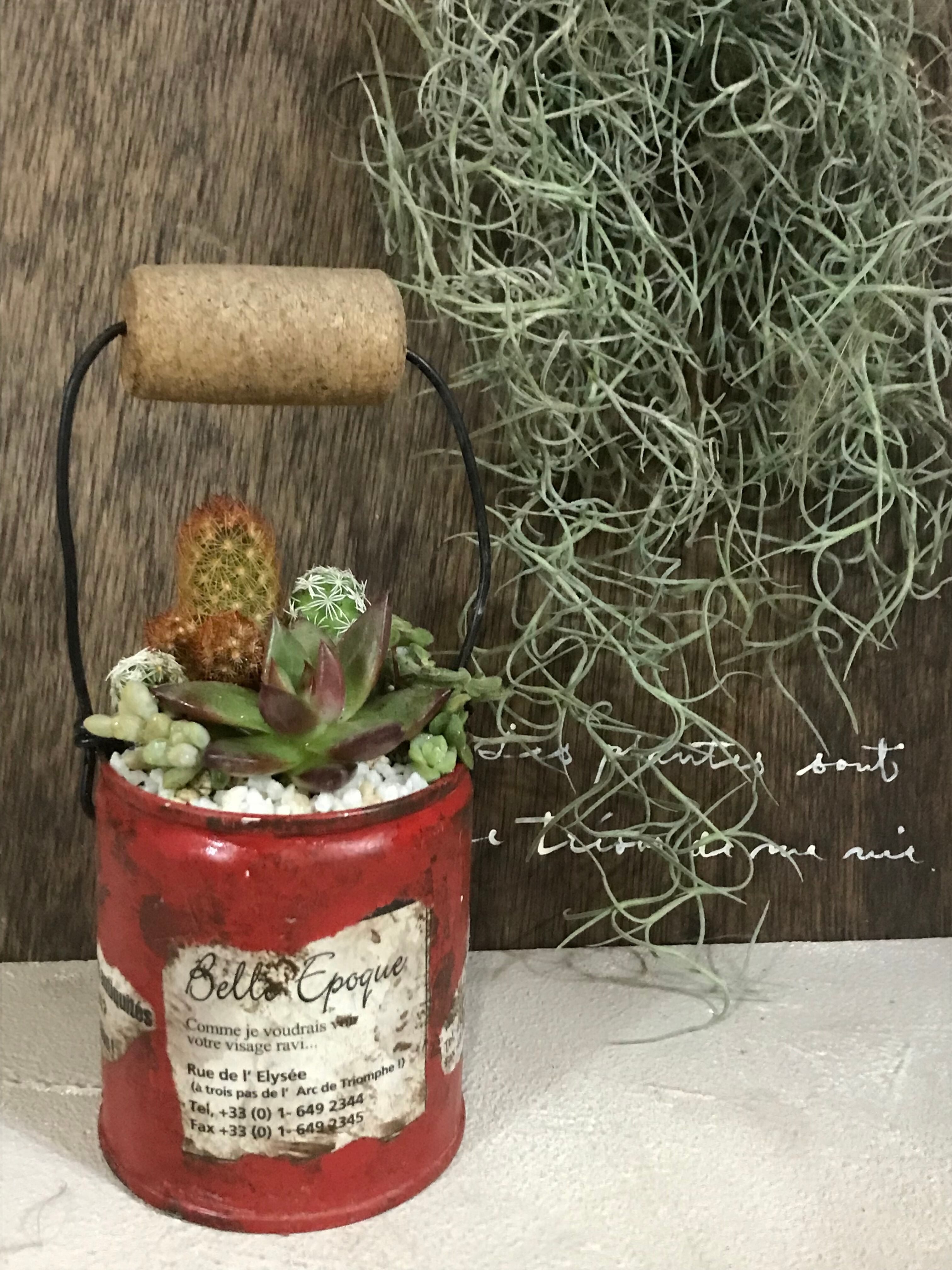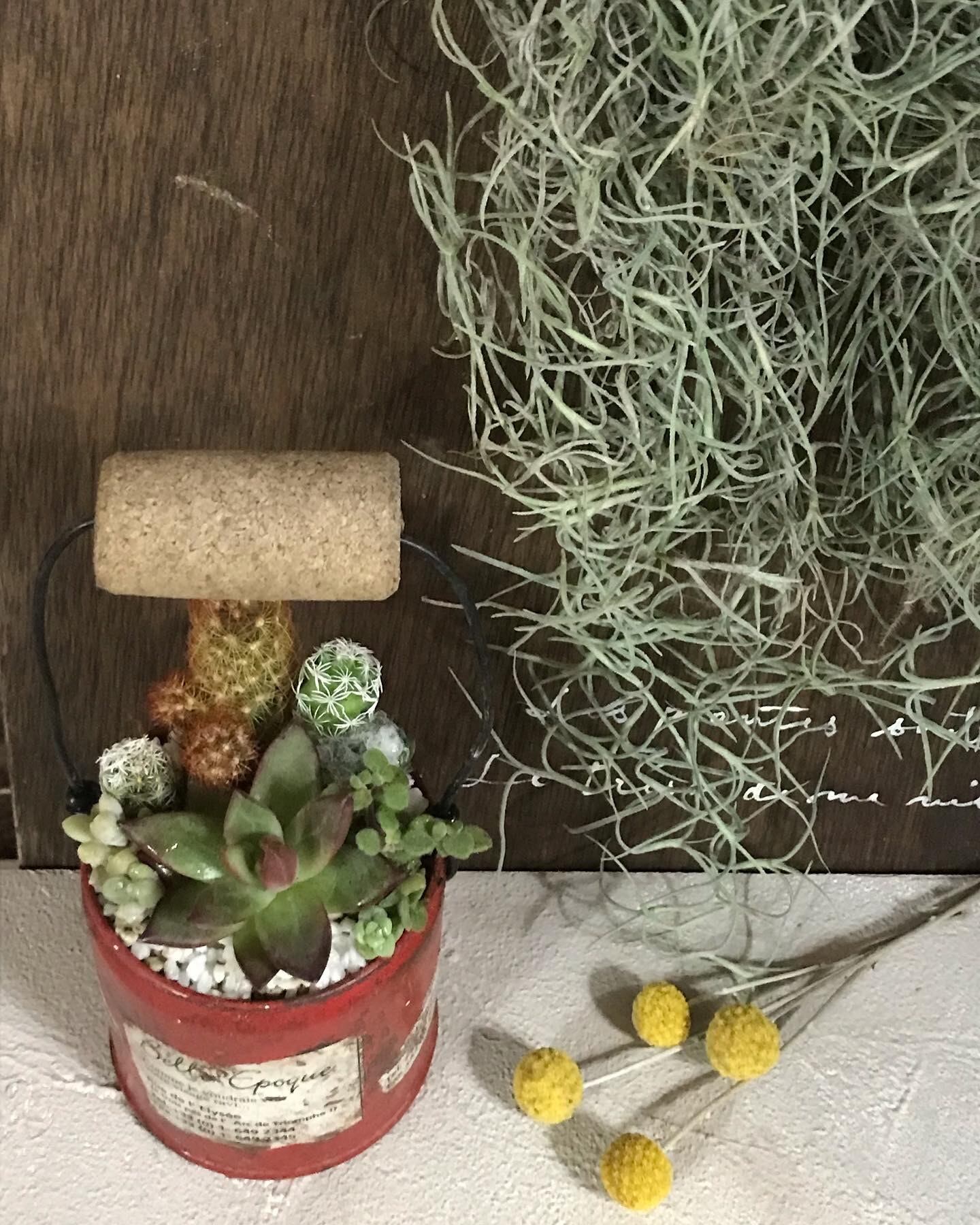 小さなサボテンが可愛らしく寄り植えられており、部屋のインテリアやデスクの上に置いても素敵です。サボテンは水やりの管理が簡単で、日光があまり当たらなくても育ちますので、初心者の方にもおすすめです。また、空気を浄化する効果もあり、リラックスや集中力のアップにも効果的です。