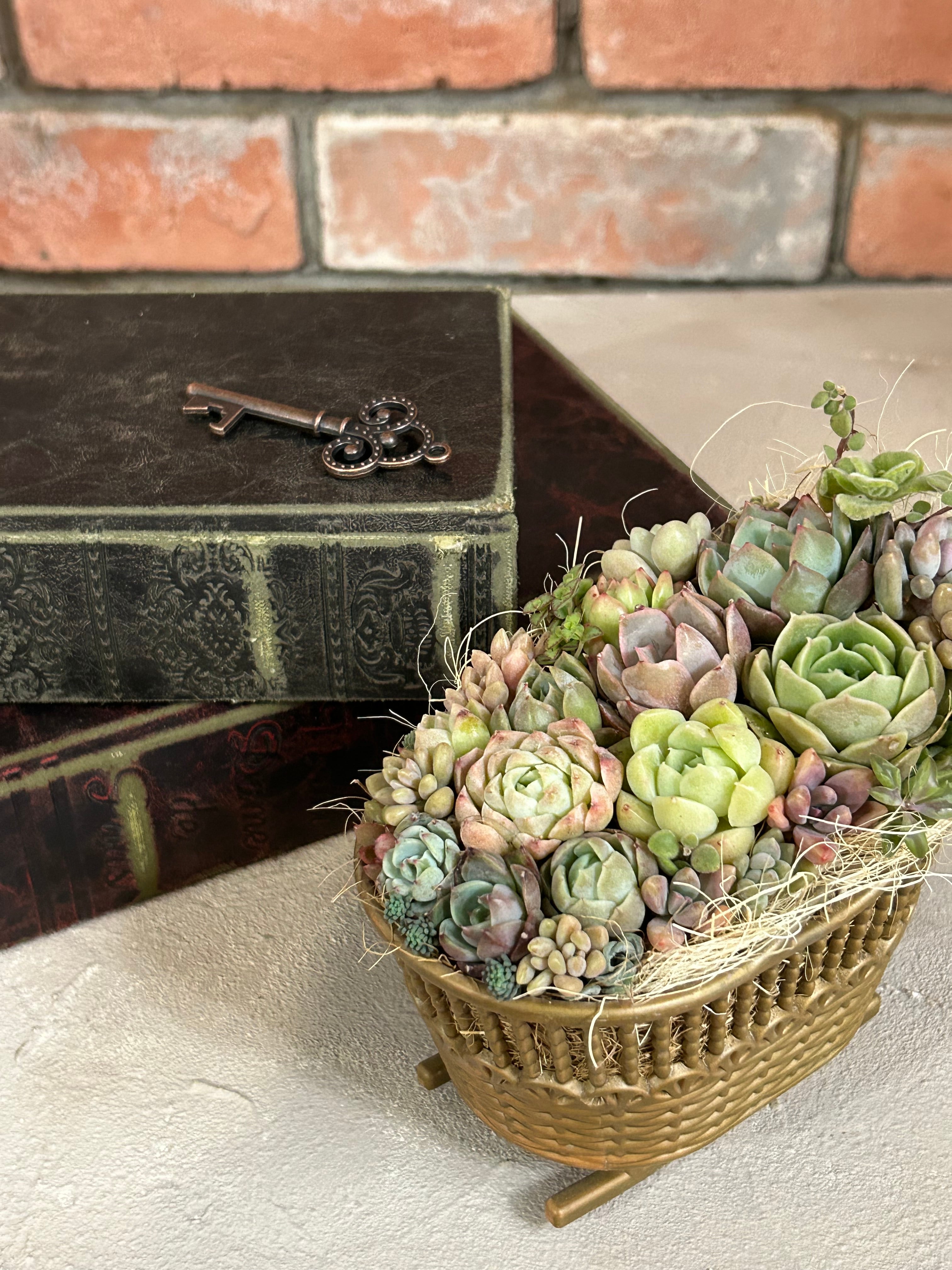 可愛らしいゆりかご型の鉢に植えられた多肉植物寄せ植えです。個性的な形状と鮮やかな色合いの多肉植物が、お部屋を明るく華やかに演出します。お手入れが簡単で、初心者から上級者まで楽しめる一品です。